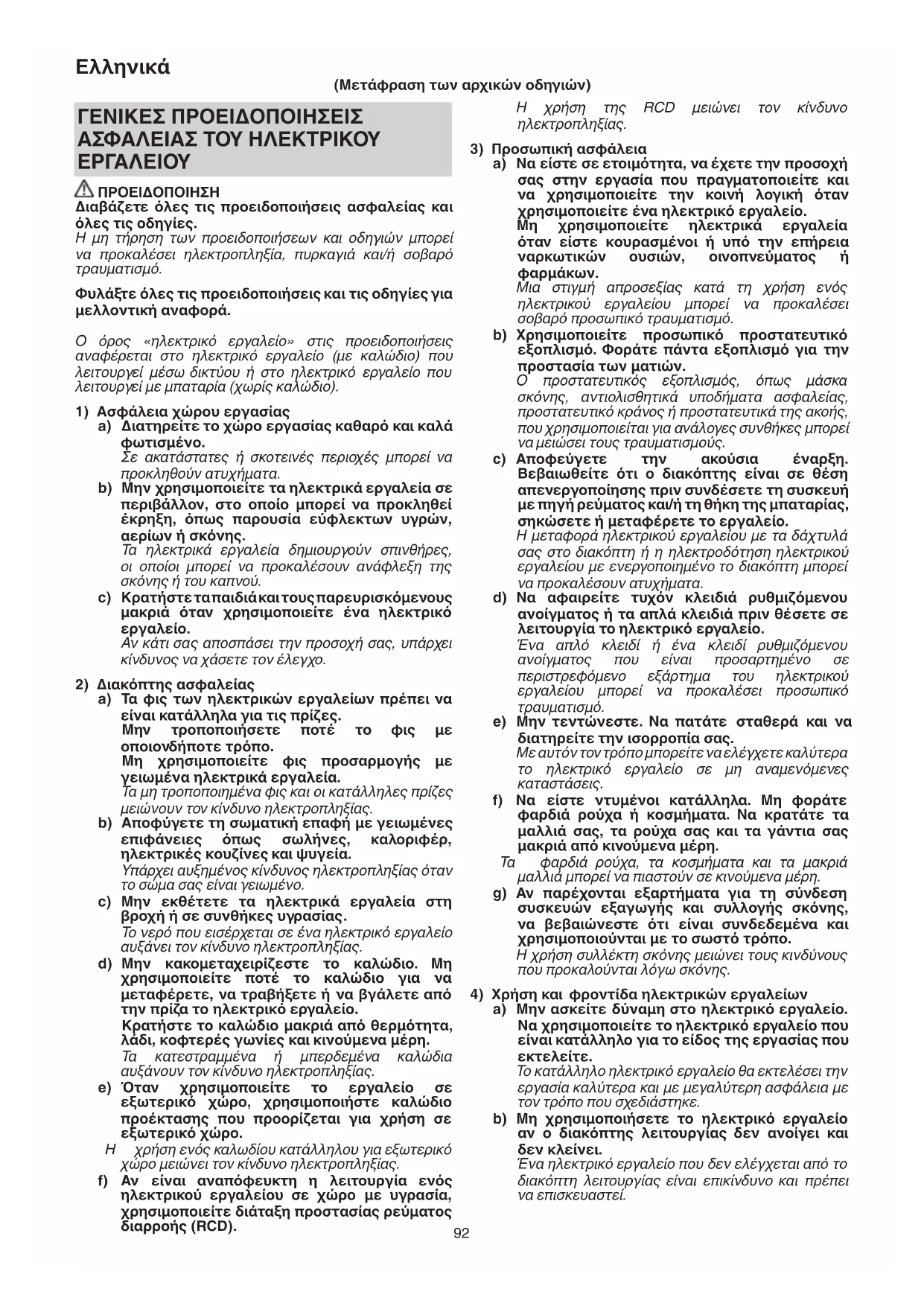 ΠΡΟΕΙΔΟΠΟΙΗΣΗ Διαβάζετε όλες τις προειδοποιήσεις ασφαλείας και όλες τις οδηγίες. Η μη τήρηση των προειδοποιήσεων και οδηγιών μπορεί να προκαλέσει ηλεκτροπληξία, πυρκαγιά και/ή σοβαρό τραυματισμό. Φυλάξτε όλες τις προειδοποιήσεις και τις οδηγίες για μελλοντική αναφορά. Ο όρος «ηλεκτρικό εργαλείο» στις προειδοποιήσεις αναφέρεται στο ηλεκτρικό εργαλείο (με καλώδιο) που λειτουργεί μέσω δικτύου ή στο ηλεκτρικό εργαλείο που λειτουργεί με μπαταρία (χωρίς καλώδιο).