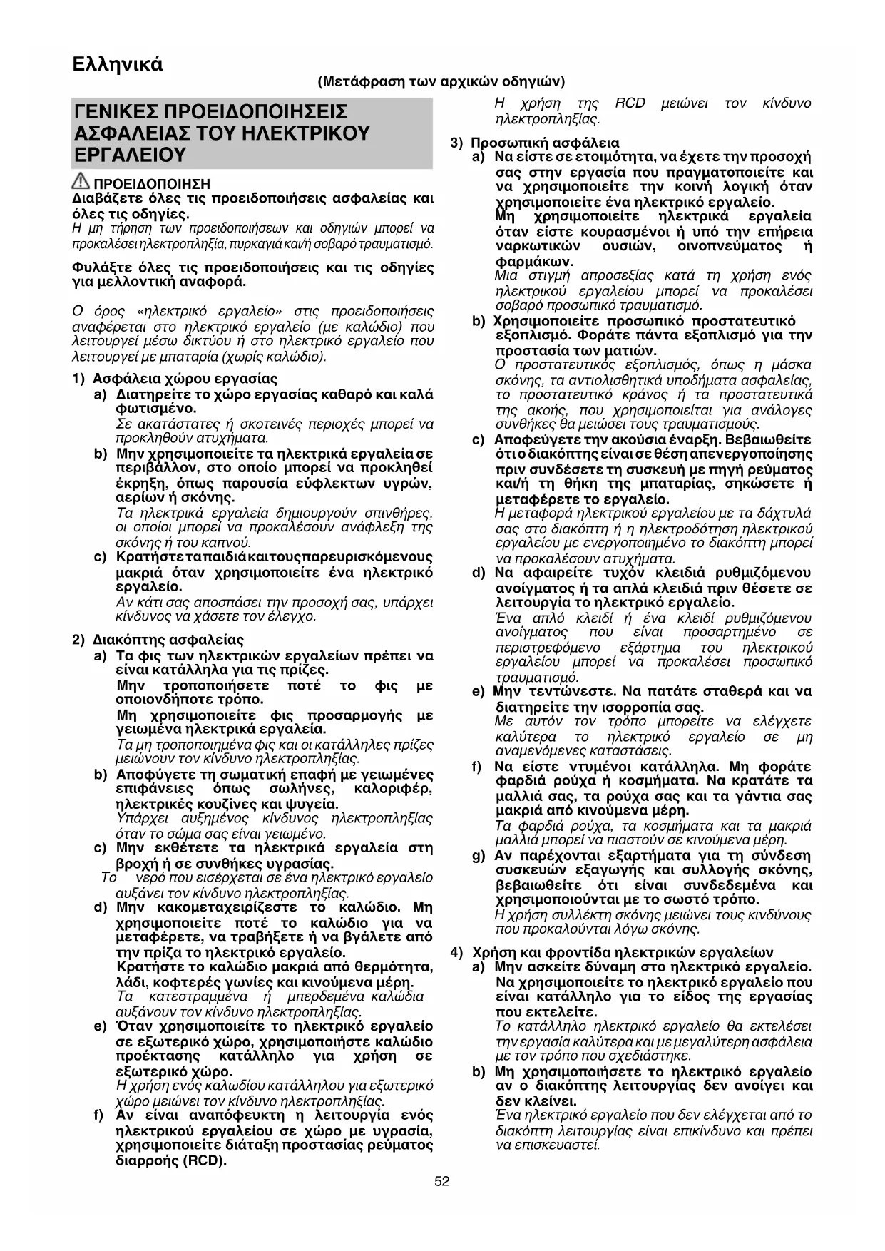 ΠΡΟΕΙΔΟΠΟΙΗΣΗ Διαβάζετε όλες τις προειδοποιήσεις ασφαλείας και όλες τις οδηγίες. Η μη τήρηση των προειδοποιήσεων και οδηγιών μπορεί να προκαλέσει ηλεκτροπληξία, πυρκαγιά και/ή σοβαρό τραυματισμό. Φυλάξτε όλες τις προειδοποιήσεις και τις οδηγίες για μελλοντική αναφορά. Ο όρος «ηλεκτρικό εργαλείο» στις προειδοποιήσεις αναφέρεται στο ηλεκτρικό εργαλείο (με καλώδιο) που λειτουργεί μέσω δικτύου ή στο ηλεκτρικό εργαλείο που λειτουργεί με μπαταρία (χωρίς καλώδιο).