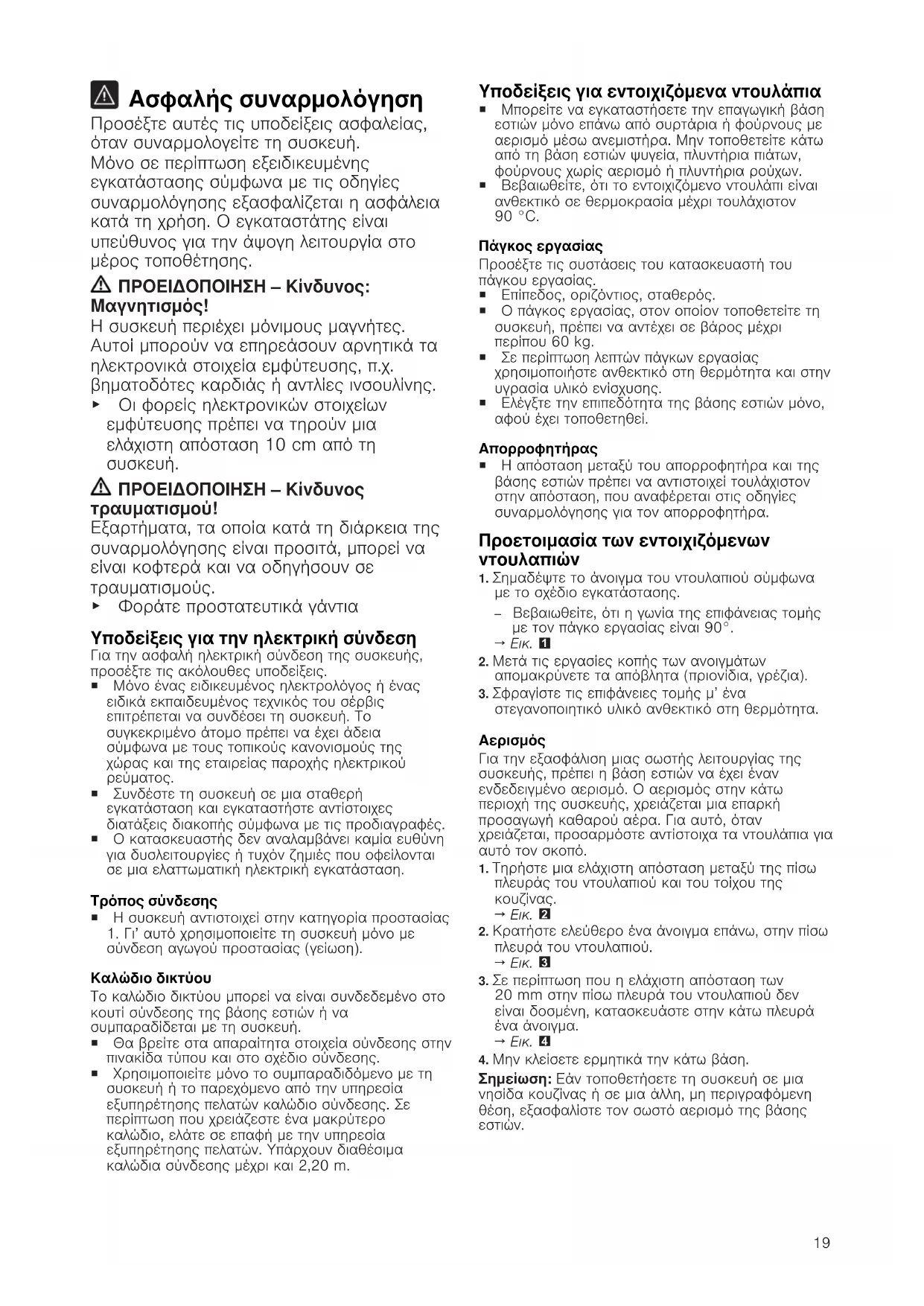 Γενικές υποδείξεις ¡ Διαβάστε προσεκτικά αυτές τις οδηγίες. ¡ Μόνο ένας αδειούχος τεχνικός επιτρέπεται να συνδέσει τη συσκευή. ¡ Μια λάθος εγκατάσταση, άνοιγμα της συσκευής, σύνδεση ή συναρμολόγηση οδηγεί σε απώλεια της ισχύος της εγγύησης του προϊόντος. ¡ Πριν την πραγματοποίηση οποιασδήποτε εργασίας, διακόψτε την παροχή ρεύματος. ¡ Εξασφαλίστε μετά την εγκατάσταση, ότι ο χρήστης δεν έχει καμία πρόσβαση στα ηλεκτρικά εξαρτήματα. ¡ Μη χρησιμοποιήσετε ποτέ αυτή τη συσκευή σε βάρκες ή οχήματα.19 Ασφαλής συναρμολόγηση Προσέξτε αυτές τις υποδείξεις ασφαλείας, όταν συναρμολογείτε τη συσκευή. Μόνο σε περίπτωση εξειδικευμένης εγκατάστασης σύμφωνα με τις οδηγίες συναρμολόγησης εξασφαλίζεται η ασφάλεια κατά τη χρήση. Ο εγκαταστάτης είναι υπεύθυνος για την άψογη λειτουργία στο μέρος τοποθέτησης. ΠΡΟΕΙΔΟΠΟΙΗΣΗ‒Κίνδυνος: Μαγνητισμός! Η συσκευή περιέχει μόνιμους μαγνήτες. Αυτοί μπορούν να επηρεάσουν αρνητικά τα ηλεκτρονικά στοιχεία εμφύτευσης, π.χ. βηματοδότες καρδιάς ή αντλίες ινσουλίνης. ▶ Οι φορείς ηλεκτρονικών στοιχείων εμφύτευσης πρέπει να τηρούν μια ελάχιστη απόσταση 10 cm από τη