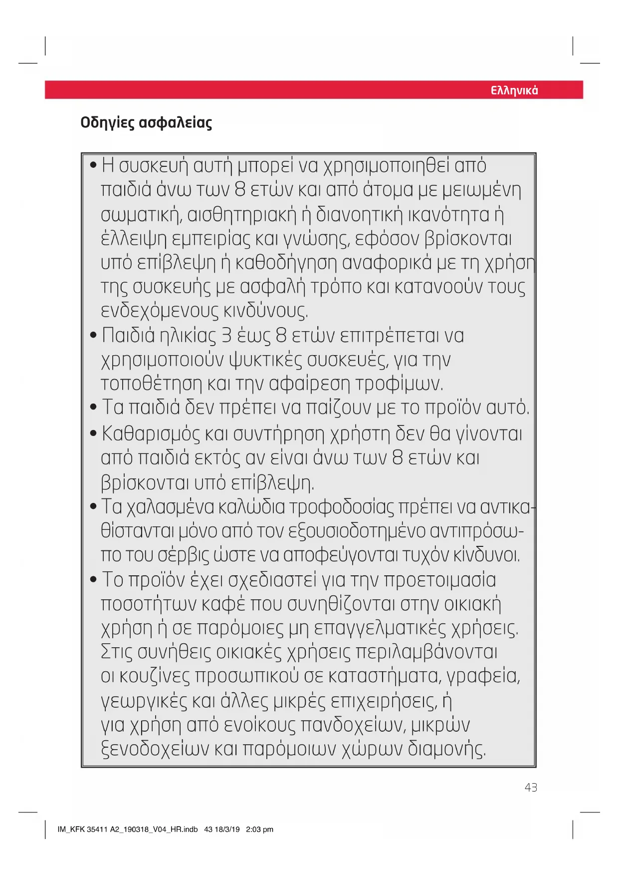 - Το προϊόν έχει σχεδιαστεί για την προετοιμασία ποσοτήτων καφέ που συνηθίζονται στην οικιακή χρήση ή σε παρόμοιες μη επαγγελματικές χρήσεις. Στις συνήθεις οικιακές χρήσεις περιλαμβάνονται οι κουζίνες προσωπικού σε καταστήματα, γραφεία, γεωργικές και άλλες μικρές επιχειρήσεις, ή για χρήση από ενοίκους πανδοχείων, μικρών ξενοδοχείων και παρόμοιων χώρων διαμονής. IM_KFK 35411 A2_190318_V04_HR.indb 43 18/3/19 2:03 pmΕλληνικά