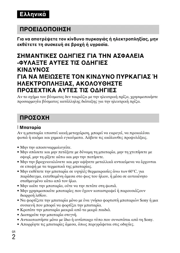 Eλληνικά ΠΡΟΕΙΔΟΠΟΙΗΣΗ Για να αποτρέψετε τον κίνδυνο πυρκαγιάς ή ηλεκτροπληξίας, μην εκθέτετε τη συσκευή σε βροχή ή υγρασία. ΣΗΜΑΝΤΙΚΕΣ ΟΔΗΓΙΕΣ ΓΙΑ ΤΗΝ ΑΣΦΑΛΕΙΑ -ΦΥΛΑΞΤΕ ΑΥΤΕΣ ΤΙΣ ΟΔΗΓΙΕΣ ΓΙΑ ΝΑ ΜΕΙΩΣΕΤΕ ΤΟΝ ΚΙΝΔΥΝΟ ΠΥΡΚΑΓΙΑΣ Ή ΗΛΕΚΤΡΟΠΛΗΞΙΑΣ, ΑΚΟΛΟΥΘΗΣΤΕ ΠΡΟΣΕΧΤΙΚΑ ΑΥΤΕΣ ΤΙΣ ΟΔΗΓΙΕΣ Αν το σχήμα του βύσματος δεν ταιριάζει με την ηλεκτρική πρίζα, χρησιμοποιήστε προσαρμογέα βύσματος κατάλληλης διάταξης για την ηλεκτρική πρίζα. ΠΡΟΣΟXΗ Αν η μπαταρία υποστεί κακή μεταχείριση, μπορεί να εκραγεί, να προκαλέσει φωτιά ή ακμα και χημικά εγκαύματα. Λάβετε τις ακλουθες προφυλάξεις.