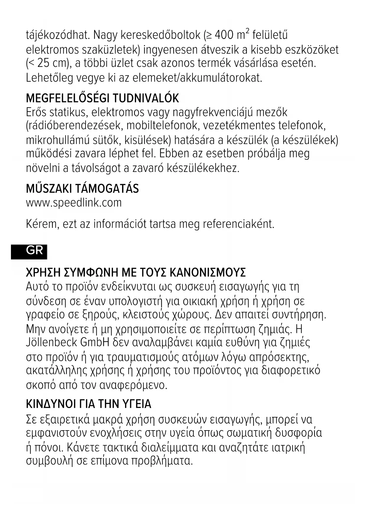 ΧΡΉΣΉ ΣΎΜΦΩΝΉ ΜΕ ΤΟΎΣ ΚΑΝΟΝΙΣΜΟΎΣ Αυτό το προϊόν ενδείκνυται ως συσκευή εισαγωγής για τη σύνδεση σε έναν υπολογιστή για οικιακή χρήση ή χρήση σε γραφείο σε ξηρούς, κλειστούς χώρους. Δεν απαιτεί συντήρηση. Μην ανοίγετε ή μη χρησιμοποιείτε σε περίπτωση ζημιάς. Η Jöllenbeck GmbH δεν αναλαμβάνει καμία ευθύνη για ζημιές στο προϊόν ή για τραυματισμούς ατόμων λόγω απρόσεκτης, ακατάλληλης χρήσης ή χρήσης του προϊόντος για διαφορετικό σκοπό από τον αναφερόμενο. ΚΙΝΔΎΝΟΙ ΓΙΑ ΤΉΝ ΎΓΕΙΑ Σε εξαιρετικά μακρά χρήση συσκευών εισαγωγής, μπορεί να εμφανιστούν ενοχλήσεις στην υγεία όπως σωματική δυσφορία ή πόνοι. Κάνετε τακτικά διαλείμματα και αναζητάτε ιατρική συμβουλή σε επίμονα προβλήματα.GR