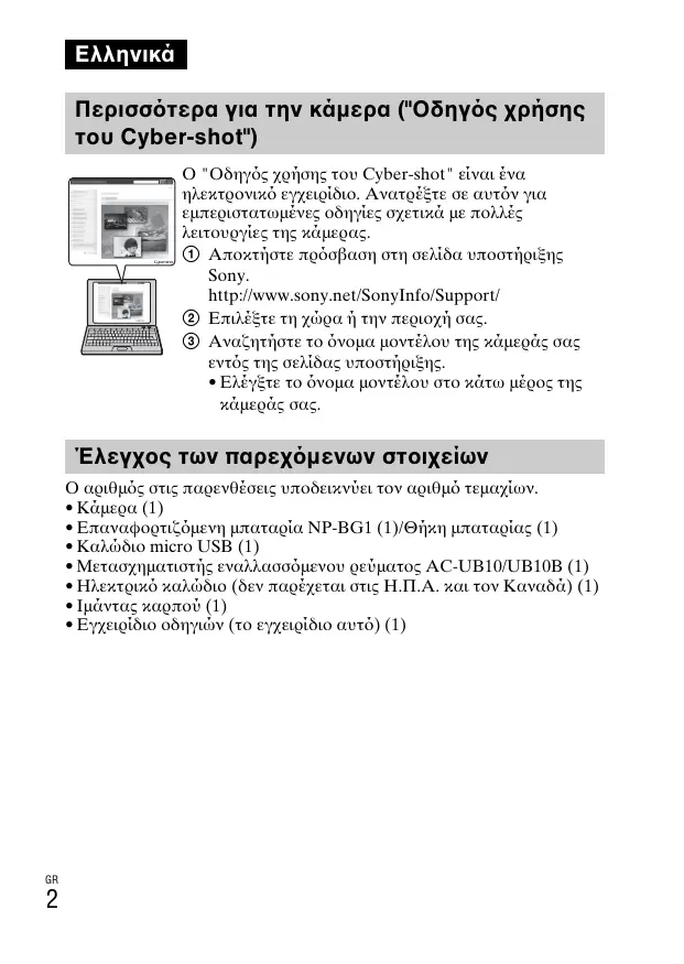 Eλληνικά Περισσ τερα για την κάμερα ("Οδηγ ς χρήσης του Cyber-shot") Ο "Οδηγς χρήσης του Cyber-shot" είναι ένα ηλεκτρονικ εγχειρίδιο. Ανατρέξτε σε αυτν για εμπεριστατωμένες οδηγίες σχετικά με πολλές λειτουργίες της κάμερας. 1 Αποκτήστε πρσβαση στη σελίδα υποστήριξης Sony. http://www.sony.net/SonyInfo/Support/ 2 Επιλέξτε τη χώρα ή την περιοχή σας. 3 Αναζητήστε το νομα μοντέλου της κάμεράς σας εντς της σελίδας υποστήριξης.