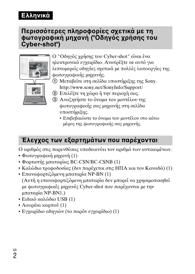 - Επαναφορτιζμενη μπαταρία NP-BN (1) (Αυτή η επαναφορτιζμενη μπαταρία δεν μπορεί να χρησιμοποιηθεί με φωτογραφικές μηχανές Cyber-shot που παρέχονται με την μπαταρία NP-BN1.)