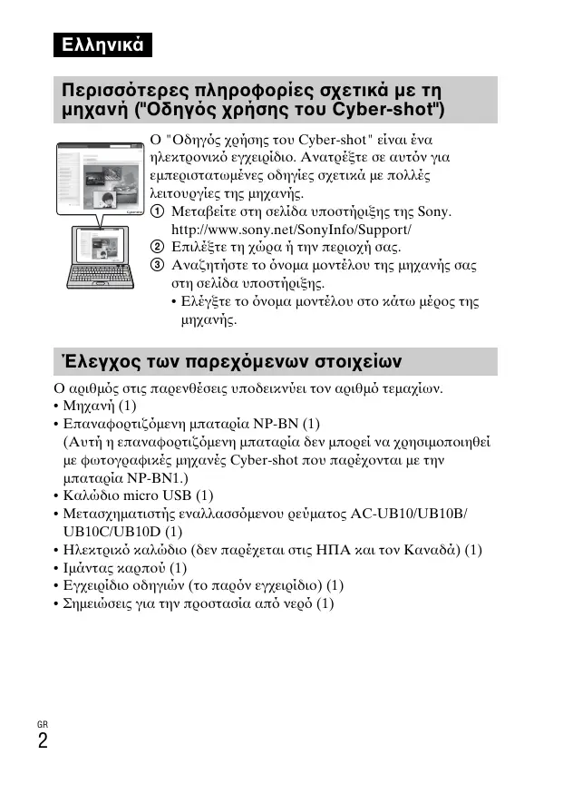 Περισσ τερες πληροφορίες σχετικά με τη μηχανή ("Οδηγ ς χρήσης του Cyber-shot") Ο "Οδηγς χρήσης του Cyber-shot" είναι ένα ηλεκτρονικ εγχειρίδιο. Ανατρέξτε σε αυτν για εμπεριστατωμένες οδηγίες σχετικά με πολλές λειτουργίες της μηχανής. 1 Μεταβείτε στη σελίδα υποστήριξης της Sony. http://www.sony.net/SonyInfo/Support/ 2 Επιλέξτε τη χώρα ή την περιοχή σας. 3 Αναζητήστε το νομα μοντέλου της μηχανής σας στη σελίδα υποστήριξης.