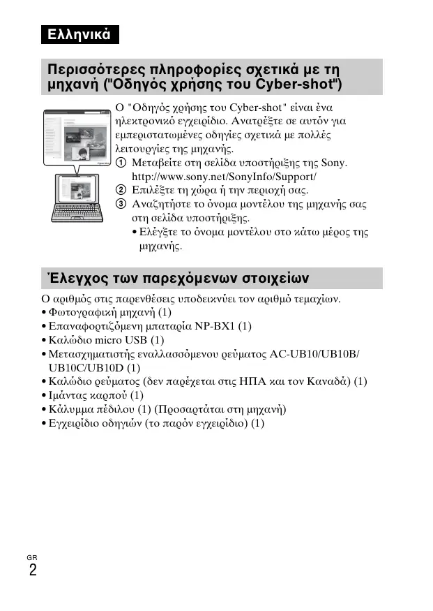 Περισσ τερες πληροφορίες σχετικά με τη μηχανή ("Οδηγ ς χρήσης του Cyber-shot") Ο "Οδηγς χρήσης του Cyber-shot" είναι ένα ηλεκτρονικ εγχειρίδιο. Ανατρέξτε σε αυτν για εμπεριστατωμένες οδηγίες σχετικά με πολλές λειτουργίες της μηχανής. 1 Μεταβείτε στη σελίδα υποστήριξης της Sony. http://www.sony.net/SonyInfo/Support/ 2 Επιλέξτε τη χώρα ή την περιοχή σας. 3 Αναζητήστε το νομα μοντέλου της μηχανής σας στη σελίδα υποστήριξης.