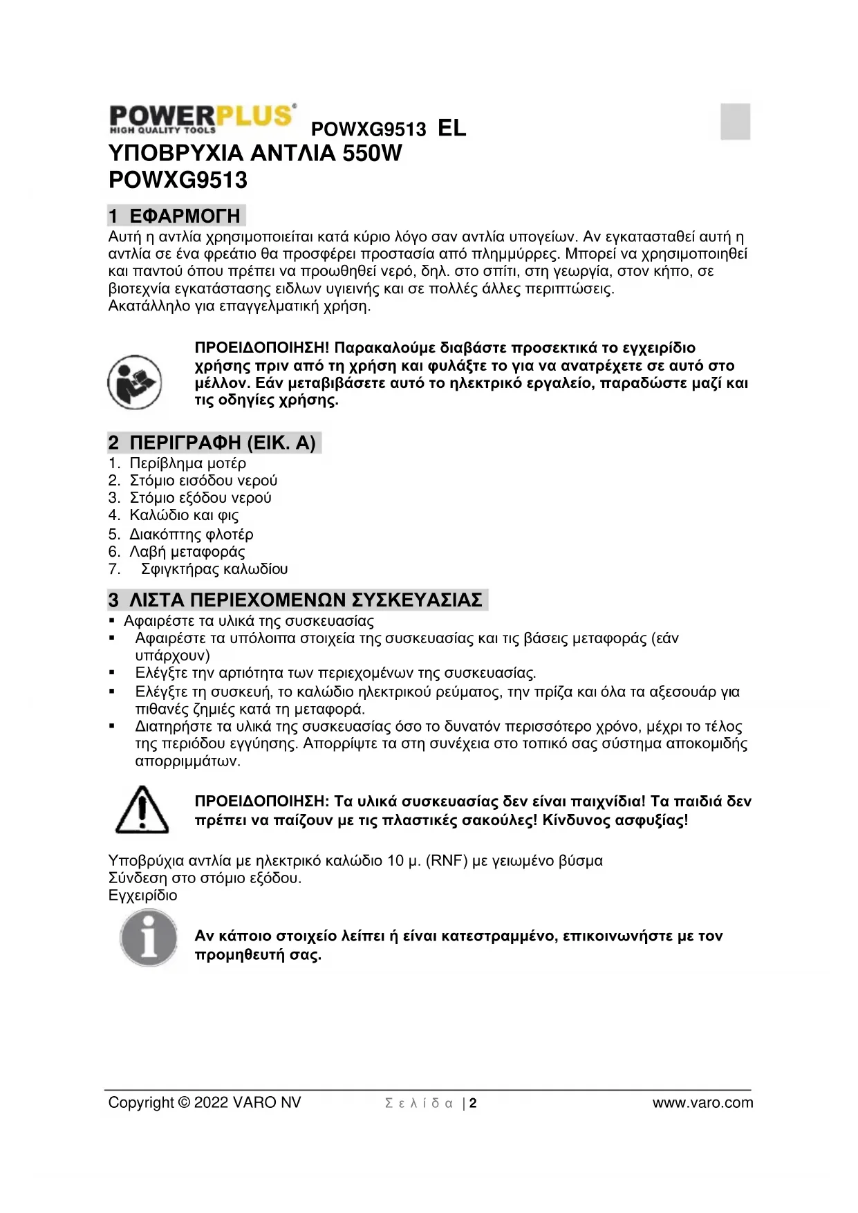 - 16 ΔΗΛΩΣΗ ΣΥΜΜΟΡΦΩΣΗΣ POWXG9513 EL Copyright © 2022 VARO NV Σ ε λ ί δ α | 2 www.varo.com ΥΠΟΒΡΥΧΙΑ ΑΝΤΛΙΑ 550W POWXG9513 1 ΕΦΑΡΜΟΓΗ Αυτή η αντλία χρησιμοποιείται κατά κύριο λόγο σαν αντλία υπογείων. Αν εγκατασταθεί αυτή η αντλία σε ένα φρεάτιο θα προσφέρει προστασία από πλημμύρρες. Μπορεί να χρησιμοποιηθεί και παντού όπου πρέπει να προωθηθεί νερό, δηλ. στο σπίτι, στη γεωργία, στον κήπο, σε βιοτεχνία εγκατάστασης ειδλων υγιεινής και σε πολλές άλλες περιπτώσεις. Ακατάλληλο για επαγγελματική χρήση. ΠΡΟΕΙΔΟΠΟΙΗΣΗ! Παρακαλούμε διαβάστε προσεκτικά το εγχειρίδιο χρήσης πριν από τη χρήση και φυλάξτε το για να ανατρέχετε σε αυτό στο μέλλον. Εάν μεταβιβάσετε αυτό το ηλεκτρικό εργαλείο, παραδώστε μαζί και τις οδηγίες χρήσης. 2 ΠΕΡΙΓΡΑΦΗ (ΕΙΚ. A) p. 8