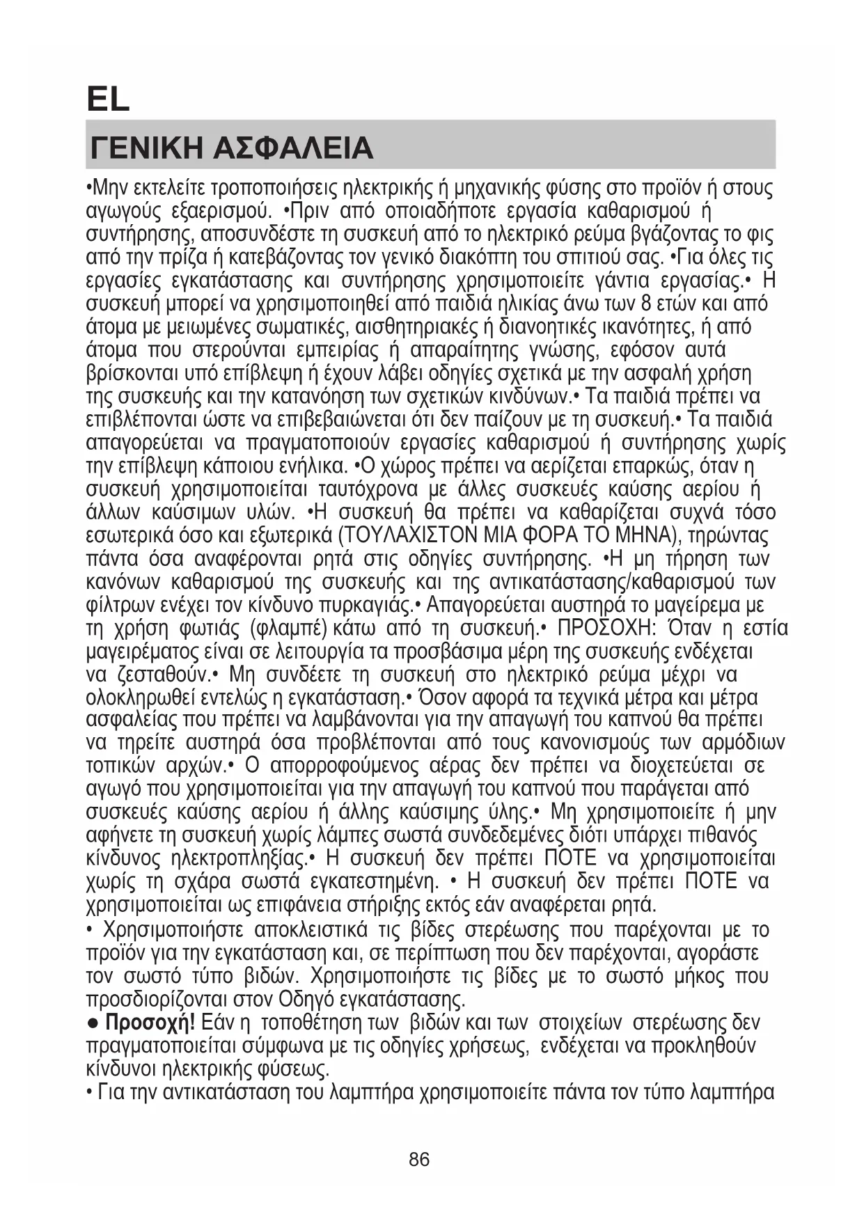 - Για την αντικατάσταση του λαμπτήρα χρησιμοποιείτε πάντα τον τύπο λαμπτήρα 86που υποδεικνύεται στην ενότητα συντήρηση/σύστημα φωτισμού του παρόντος εγχειριδίου. • Η χρήση φωτιάς κατά το μαγείρεμα θα πρέπει να αποφεύγεται σε κάθε περίπτωση διότι μπορεί να προκαλέσει ζημιά στα φίλτρα ή πυρκαγιά. • Το τηγάνισμα πρέπει να γίνεται υπό επίβλεψη διότι υπάρχει κίνδυνος το καυτό λάδι να αρπάξει φωτιά. • Σε περίπτωση αμφιβολίας, συμβουλευτείτε το εξουσιοδοτημένο κέντρο υποστήριξης ή παρόμοιο εξειδικευμένο προσωπικό. Προσοχή! Μην το χρησιμοποιείτε με προγραμματιστή, χρονοδιακόπτη, ξεχωριστό τηλεχειριστήριο ή οποιαδήποτε άλλη συσκευή που ενεργοποιείται