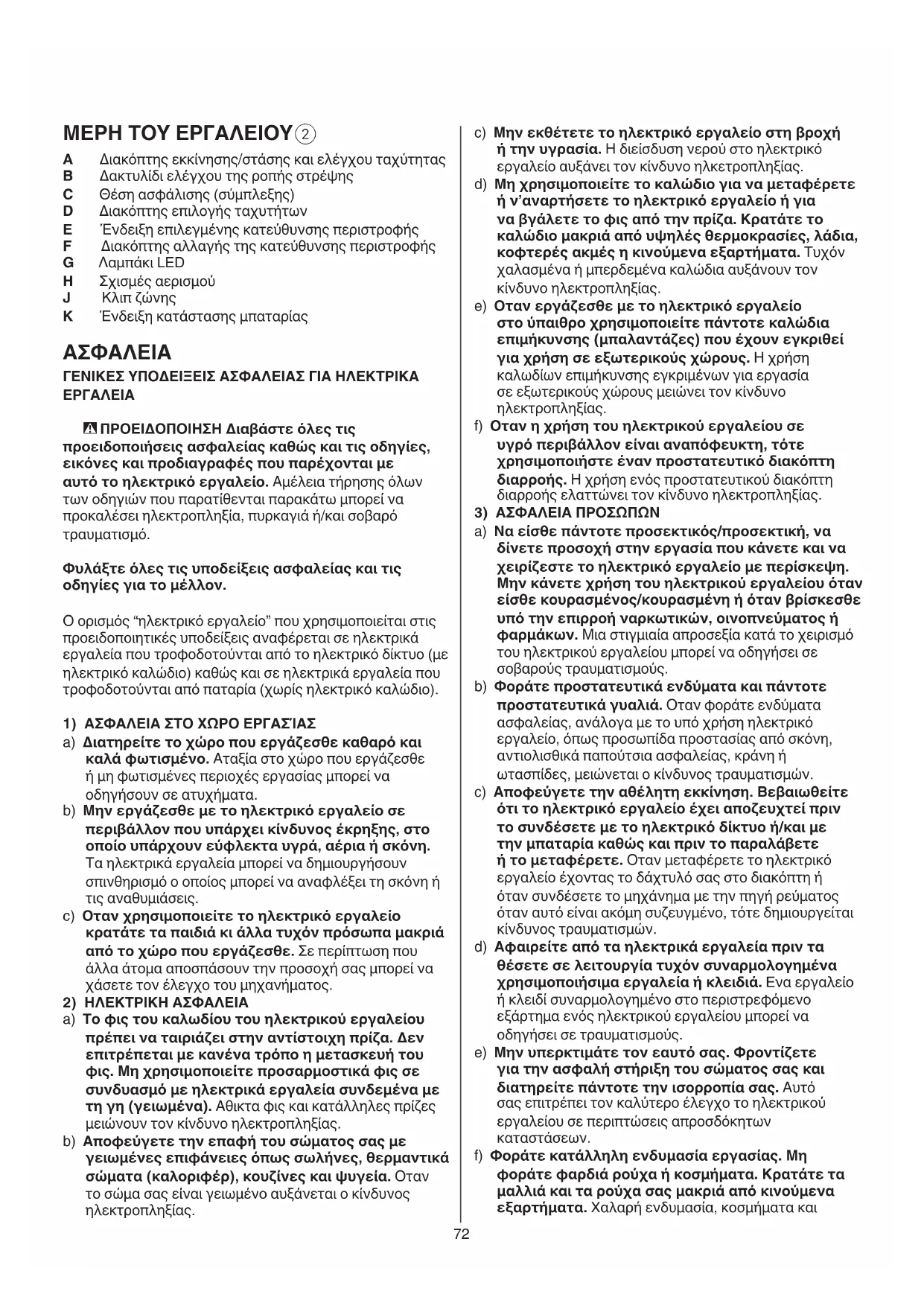 A Διακόπτης εκκίνησης/στάσης και ελέγχου ταχύτητας B Δακτυλίδι ελέγχου της ροπής στρέψης C Θέση ασφάλισης (σύμπλεξης) D Διακόπτης επιλογής ταχυτήτων E Ένδειξη επιλεγµένης κατεύθυνσης περιστροφής F Διακόπτης αλλαγής της κατεύθυνσης περιστροφής G Λαµπάκι LED H Σχισμές αερισμού J Κλιπ ζώνης K Ένδειξη κατάστασης μπαταρίας