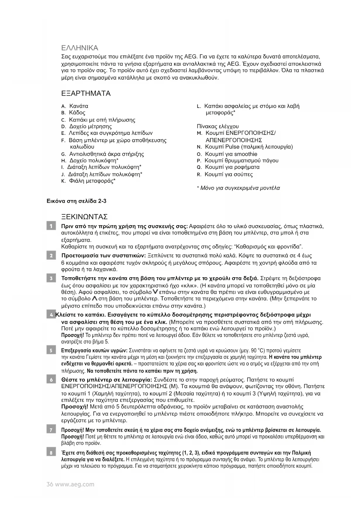 Προειδοποίηση! Μην βυθίζετε το περίβλημα, το φις ή το καλώδιο σε νερό ή σε οποιοδήποτε άλλο υγρό. 15 Πλήρης καθαρισμός της κανάτας: Σημείωση! Το συγκρότημα των λεπίδων δεν αφαιρείται. Άφαιρέστε το καπάκι και το δοχείο μέτρησης. Πλύνετε το συγκρότημα των λεπίδων με νερό και απορρυπαντικό και, στη συνέχεια, τοποθετήστε το δοχείο μέτρησης και την κανάτα στο πλυντήριο πιάτων για να καθαριστούν πλήρως. Προσοχή! Χειριστείτε τις λεπίδες με προσοχή καθώς είναι πολύ αιχμηρές! Όλα τα μέρη είναι κατάλληλα για πλυντήριο πιάτων, εκτός από τη βάση του μπλέντερ. Απολαύστε το καινούριο σας προϊόν της AEG! ΥΠΟΔΕΙΞΕΙΣ ΆΣΦΆΛΕΙΆΣ Διαβάστε προσεκτικά τις παρακάτω οδηγίες πριν χρησιμοποιήσετε για πρώτη φορά τη συσκευή.