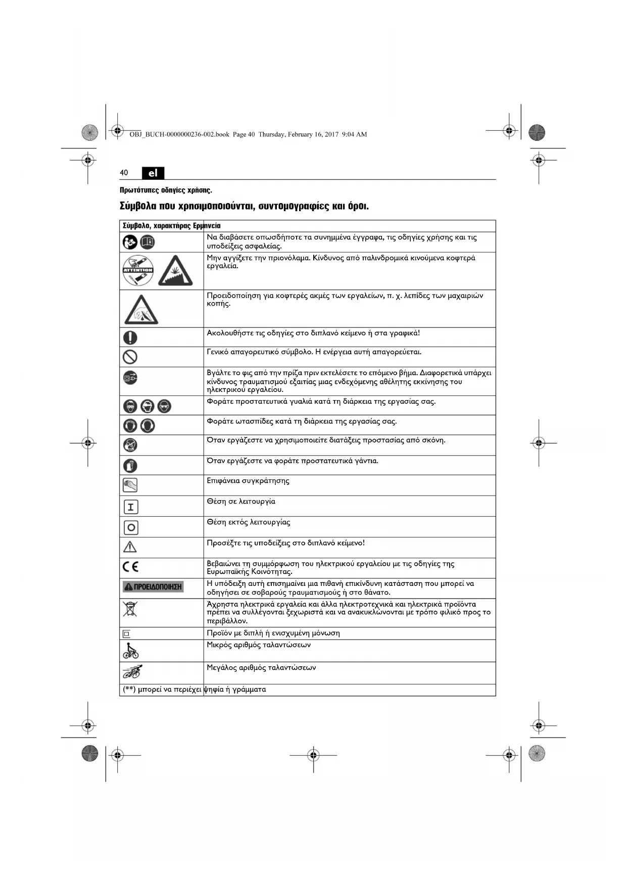 Ακολουθήστε τις οδηγίες στο διπλανό κείμενο ή στα γραφικά! Γενικό απαγορευτικό σύμβολο. Η ενέργεια αυτή απαγορεύεται. Βγάλτε το φις από την πρίζα πριν εκτελέσετε το επόμενο βήμα. Διαφορετικά υπάρχει κίνδυνος τραυματισμού εξαιτίας μιας ενδεχόμενης αθέλητης εκκίνησης του ηλεκτρικού εργαλείου. Φοράτε προστατευτικά γυαλιά κατά τη διάρκεια της εργασίας σας. Φοράτε ωτασπίδες κατά τη διάρκεια της εργασίας σας. Όταν εργάζεστε να χρησιμοποιείτε διατάξεις προστασίας από σκόνη. Όταν εργάζεστε να φοράτε προστατευτικά γάντια. Επιφάνεια συγκράτησης Θέση σε λειτουργία Θέση εκτός λειτουργίας Προσέξτε τις υποδείξεις στο διπλανό κείμενο! Βεβαιώνει τη συμμόρφωση του ηλεκτρικού εργαλείου με τις οδηγίες της Ευρωπαϊκής Κοινότητας. Η υπόδειξη αυτή επισημαίνει μια πιθανή επικίνδυνη κατάσταση που μπορεί να οδηγήσει σε σοβαρούς τραυματισμούς ή στο θάνατο. Άχρηστα ηλεκτρικά εργαλεία και άλλα ηλεκτροτεχνικά και ηλεκτρικά προϊόντα πρέπει να συλλέγονται ξεχωριστά και να ανακυκλώνονται με τρόπο φιλικό προς το περιβάλλον. Προϊόν με διπλή ή ενισχυμένη μόνωση Μικρός αριθμός ταλαντώσεων Μεγάλος αριθμός ταλαντώσεων (**) μπορεί να περιέχει ψηφία ή γράμματα OBJ_BUCH-0000000236-002.book Page 40 Thursday, February 16, 2017 9:04 AM41