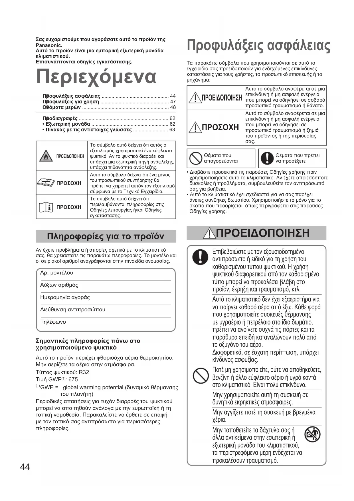 - •Πίνακαςμετιςαντίστοιχεςγλώσσες Περιεχόμενα Προφυλάξειςασφάλειας Πληροφορίεςγιατοπροϊόν Αν έχετε προβλήματα ή απορίες σχετικά με το κλιματιστικό σας, θα χρειαστείτε τις παρακάτω πληροφορίες. Το μοντέλο και οι σειριακοί αριθμοί αναγράφονται στην πινακίδα ονομασίας.Αρ. μοντέλου Αύξων αριθμός Ημερομηνία αγοράςΔιεύθυνση αντιπροσώπουΤηλέφωνοΕπιβεβαιώστε με τον εξουσιοδοτημένο αντιπρόσωπο ή ειδικό για τη χρήση του καθορισμένου τύπου ψυκτικού. Η χρήση ψυκτικού διαφορετικού από τον καθορισμένο τύπο μπορεί να προκαλέσει βλάβη στο προϊόν, έκρηξη και τραυματισμό, κτλ.Αυτό το κλιματιστικό δεν έχει εξαεριστήρα για να παίρνει καθαρό αέρα από έξω. Κάθε φορά που χρησιμοποιείτε συσκευές θέρμανσης με υγραέριο ή πετρέλαιο στο ίδιο δωμάτιο, πρέπει να ανοίγετε συχνά τις πόρτες και τα παράθυρα επειδή καταναλώνουν πολύ από το οξυγόνο του αέρα. Διαφορετικά, σε έσχατη περίπτωση, υπάρχει κίνδυνος ασφυξίας.Ποτέ μη χρησιμοποιείτε, ούτε να αποθηκεύετε, βενζίνη ή άλλο εύφλεκτο αέριο ή υγρό κοντά στο κλιματιστικό. Είναι πολύ επικίνδυνο.Μην χρησιμοποιείτε αυτή τη συσκευή σε δυνητικά εκρηκτικές ατμόσφαιρες.Μην αγγίζετε ποτέ τη συσκευή με βρεγμένα χέρια.Μην τοποθετείτε τα δάχτυλα σας ή άλλα αντικείμενα στην εσωτερική ή εξωτερική μονάδα του κλιματιστικού, τα περιστρεφόμενα μέρη ενδέχεται να προκαλέσουν τραυματισμό.Τα παρακάτω σύμβολα που χρησιμοποιούνται σε αυτό το εγχειρίδιο σας προειδοποιούν για ενδεχόμενες επικίνδυνες καταστάσεις για τους χρήστες, το προσωπικό επισκευής ή το μηχάνημα: ΠΡΟΕΙΔΟΠΟΙΗΣΗ Αυτό το σύμβολο αναφέρεται σε μια επικίνδυνη ή μη ασφαλή ενέργεια που μπορεί να οδηγήσει σε σοβαρό προσωπικό τραυματισμό ή θάνατο. Αυτό το σύμβολο αναφέρεται σε μια επικίνδυνη ή μη ασφαλή ενέργεια που μπορεί να οδηγήσει σε προσωπικό τραυματισμό ή ζημιά του προϊόντος ή της περιουσίας Θέματα που απαγορεύονταιΘέματα που πρέπει να προσέξετε• Διαβάστε προσεκτικά τις παρούσες Οδηγίες χρήσης πριν χρησιμοποιήσετε αυτό το κλιματιστικό. Αν έχετε οποιεσδήποτε δυσκολίες ή προβλήματα, συμβουλευθείτε τον αντιπρόσωπό σας για βοήθεια.• Αυτό το κλιματιστικό έχει σχεδιαστεί για να σας παρέχει άνετες συνθήκες δωματίου. Χρησιμοποιήστε το μόνο για το σκοπό που προορίζεται, όπως περιγράφεται στις παρούσες Οδηγίες χρήσης. ΠΡΟΕΙΔΟΠΟΙΗΣΗ ΣαςευχαριστούμεπουαγοράσατεαυτότοπροϊόντηςPanasonic.Αυτότοπροϊόνείναιμιαεμπορικήεξωτερικήμονάδακλιματιστικού.Επισυνάπτονταιοδηγίεςεγκατάστασης.ΠΡΟΕΙΔΟΠΟΙΗΣΗΤο σύμβολο αυτό δείχνει ότι αυτός ο εξοπλισμός χρησιμοποιεί ένα εύφλεκτο ψυκτικό. Αν το ψυκτικό διαρρέει και υπάρχει μια εξωτερική πηγή ανάφλεξης, υπάρχει πιθανότητα ανάφλεξης.ΠΡΟΣΟΧΗΑυτό το σύμβολο δείχνει ότι ένα μέλος του προσωπικού συντήρησης θα πρέπει να χειριστεί αυτόν τον εξοπλισμό σύμφωνα με το Τεχνικό Εγχειρίδιο.ΠΡΟΣΟΧΗΤο σύμβολο αυτό δείχνει ότι περιλαμβάνονται πληροφορίες στις Οδηγίες λειτουργίας ή/και Οδηγίες εγκατάστασης.ΣημαντικέςπληροφορίεςπάνωστοχρησιμοποιούμενοψυκτικόΑυτό το προϊόν περιέχει φθοριούχα αέρια θερμοκηπίου. Μην αερίζετε τα αέρια στην ατμόσφαιρα.Τύπος ψυκτικού: R32Τιμή GWP (1) : 675 (1) GWP = global warming potential (δυναμικό θέρμανσης του πλανήτη)Περιοδικές απαιτήσεις για τυχόν διαρροές του ψυκτικού μπορεί να απαιτηθούν ανάλογα με την ευρωπαϊκή ή τη τοπική νομοθεσία. Παρακαλείστε να έρθετε σε επαφή με τον τοπικό σας αντιπρόσωπο για περισσ