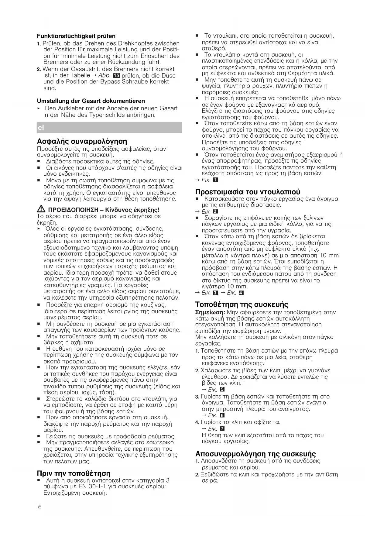 Ασφαλής συναρμολόγηση Προσέξτε αυτές τις υποδείξεις ασφαλείας, όταν συναρμολογείτε τη συσκευή. ¡ Διαβάστε προσεκτικά αυτές τις οδηγίες. ¡ Οι εικόνες που υπάρχουν σ'αυτές τις οδηγίες είναι μόνο ενδεικτικές. ¡ Μόνο με τη σωστή τοποθέτηση σύμφωνα με τις οδηγίες τοποθέτησης διασφαλίζεται η ασφάλεια κατά τη χρήση. Ο εγκαταστάτης είναι υπεύθυνος για την άψογη λειτουργία στη θέση τοποθέτησης. ΠΡΟΕΙΔΟΠΟΙΗΣΗ‒Κίνδυνος έκρηξης! Το αέριο που διαρρέει μπορεί να οδηγήσει σε