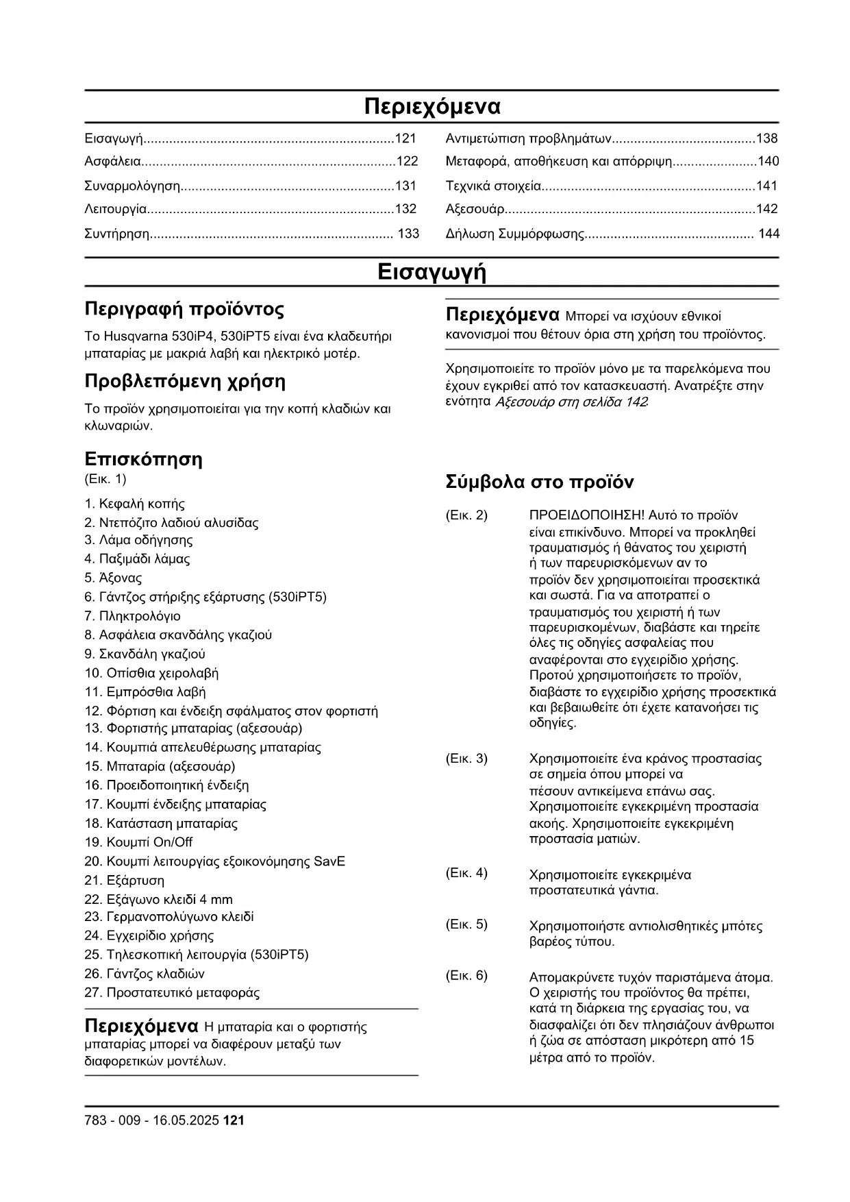 Περιεχόμενα Η μπαταρία και ο φορτιστής μπαταρίας μπορεί να διαφέρουν μεταξύ των διαφορετικών μοντέλων. Σύμβολα στο προϊόν (Εικ. 2) ΠΡΟΕΙΔΟΠΟΙΗΣΗ! Αυτό το προϊόν είναι επικίνδυνο. Μπορεί να προκληθεί τραυματισμός ή θάνατος του χειριστή ή των παρευρισκόμενων αν το προϊόν δεν χρησιμοποιείται προσεκτικά και σωστά. Για να αποτραπεί ο τραυματισμός του χειριστή ή των παρευρισκομένων, διαβάστε και τηρείτε όλες τις οδηγίες ασφαλείας που αναφέρονται στο εγχειρίδιο χρήσης. Προτού χρησιμοποιήσετε το προϊόν, διαβάστε το εγχειρίδιο χρήσης προσεκτικά και βεβαιωθείτε ότι έχετε κατανοήσει τις