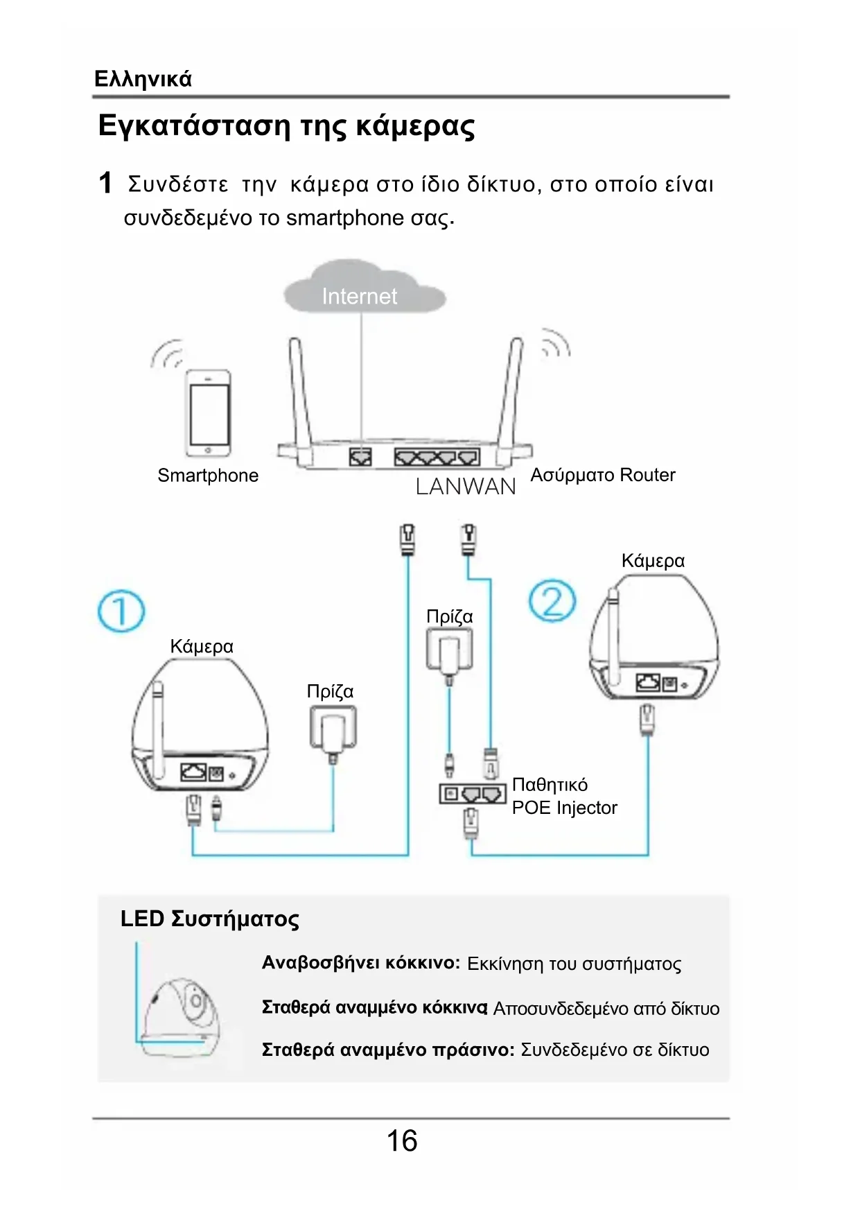 Αποσυνδεδεμένο από δίκτυοΣταθερά αναμμένο πράσινο: Συνδεδεμένο σε δίκτυο Internet Παθητικό POE Injector Κάμερα ΚάμεραΑσύρματο RouterSmartphoneΠρίζαΠρίζαEλληνικά