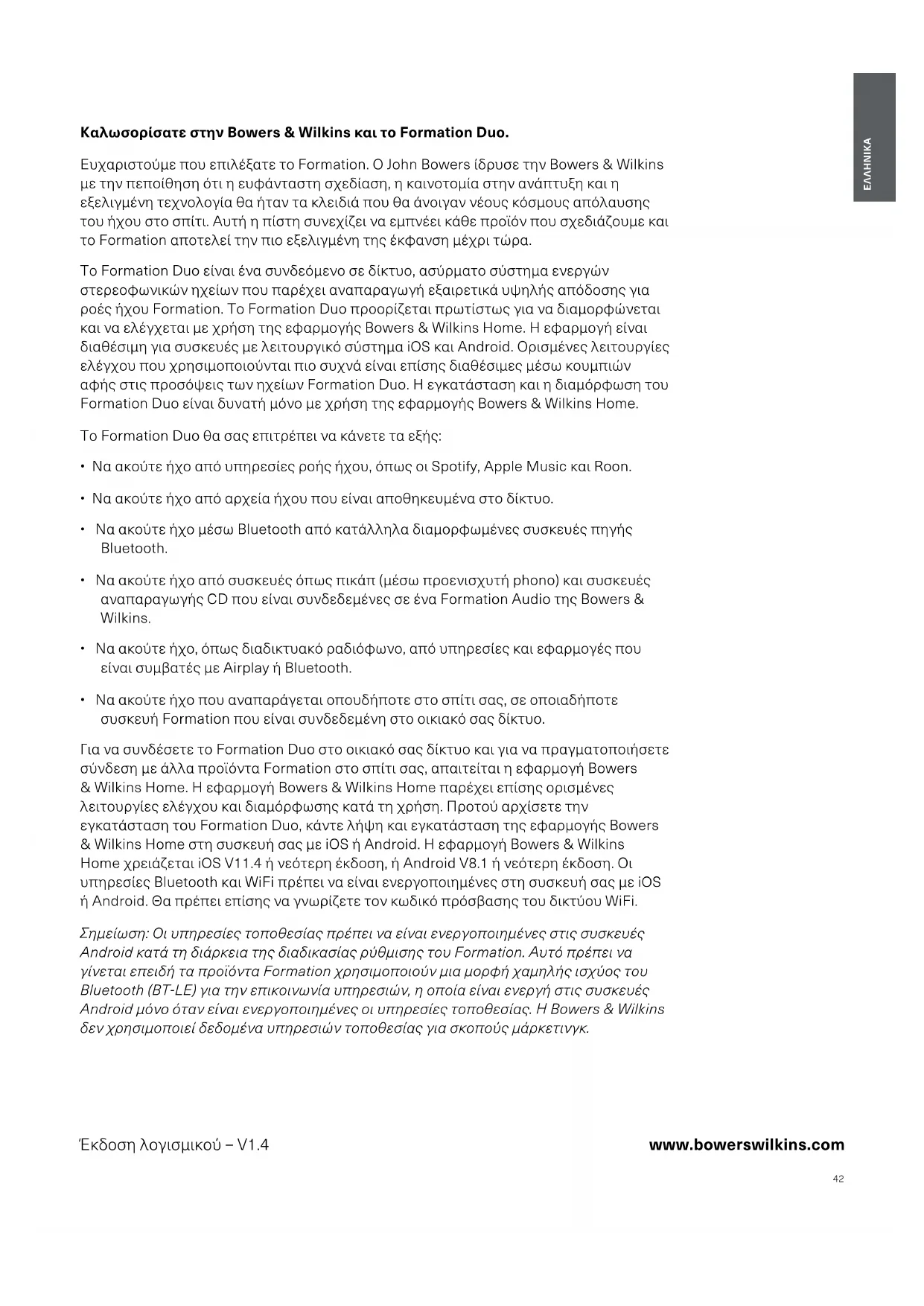 - Να ακούτε ήχο που αναπαράγεται οπουδήποτε στο σπίτι σας, σε οποιαδήποτε συσκευή Formation που είναι συνδεδεμένη στο οικιακό σας δίκτυο. Για να συνδέσετε το Formation Duo στο οικιακό σας δίκτυο και για να πραγματοποιήσετε σύνδεση με άλλα προϊόντα Formation στο σπίτι σας, απαιτείται η εφαρμογή Bowers & Wilkins Home. Η εφαρμογή Bowers & Wilkins Home παρέχει επίσης ορισμένες λειτουργίες ελέγχου και διαμόρφωσης κατά τη χρήση. Προτού αρχίσετε την εγκατάσταση του Formation Duo, κάντε λήψη και εγκατάσταση της εφαρμογής Bowers & Wilkins Home στη συσκευή σας με iOS ή Android. Η εφαρμογή Bowers & Wilkins Home χρειάζεται iOS V11.4 ή νεότερη έκδοση, ή Android V8.1 ή νεότερη έκδοση. Οι υπηρεσίες Bluetooth και WiFi πρέπει να είναι ενεργοποιημένες στη συσκευή σας με iOS ή Android. Θα πρέπει επίσης να γνωρίζετε τον κωδικό πρόσβασης του δικτύου WiFi. Σημείωση: Οι υπηρεσίες τοποθεσίας πρέπει να είναι ενεργοποιημένες στις συσκευές Android κατά τη διάρκεια της διαδικασίας ρύθμισης του Formation. Αυτό πρέπει να γίνεται επειδή τα προϊόντα Formation χρησιμοποιούν μια μορφή χαμηλής ισχύος του Bluetooth (BT-LE) για την επικοινωνία υπηρεσιών, η οποία είναι ενεργή στις συσκευές Android μόνο όταν είναι ενεργοποιημένες οι υπηρεσίες τοποθεσίας. Η Bowers & Wilkins δεν χρησιμοποιεί δεδομένα υπηρεσιών τοποθεσίας για σκοπούς μάρκετινγκ. Έκδοση λογισμικού – V1.4