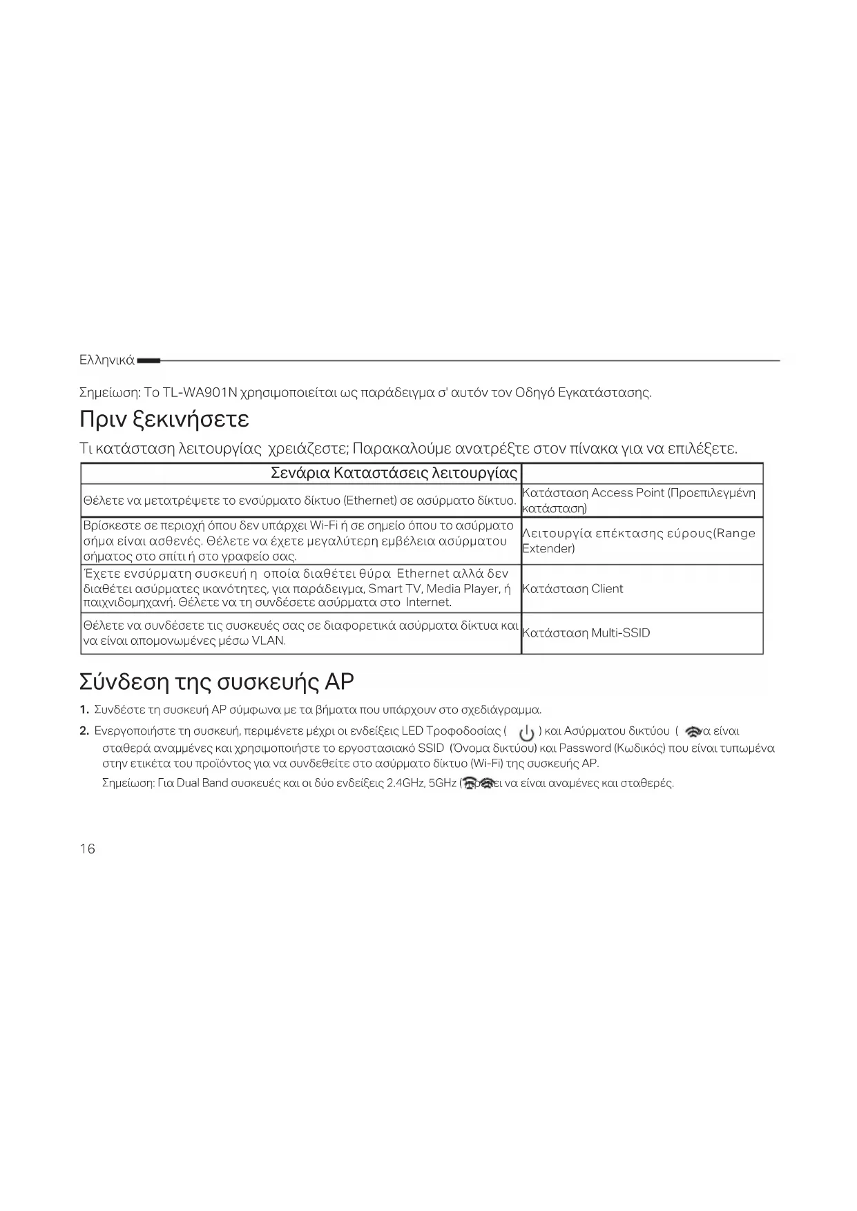 Σημείωση: Το TL-WA901N χρησιμοποιείται ως παράδειγμα σ' αυτόν τον Οδηγό Εγκατάστασης. Πριν ξεκινήσετε Τι κατάσταση λειτουργίας χρειάζεστε; Παρακαλούμε ανατρέξτε στον πίνακα για να επιλέξετε. Σενάρια Καταστάσεις λειτουργίας Θέλετε να μετατρέψετε το ενσύρματο δίκτυο (Ethernet) σε ασύρματο δίκτυο. Κατάσταση Access Point (Προεπιλεγμένη