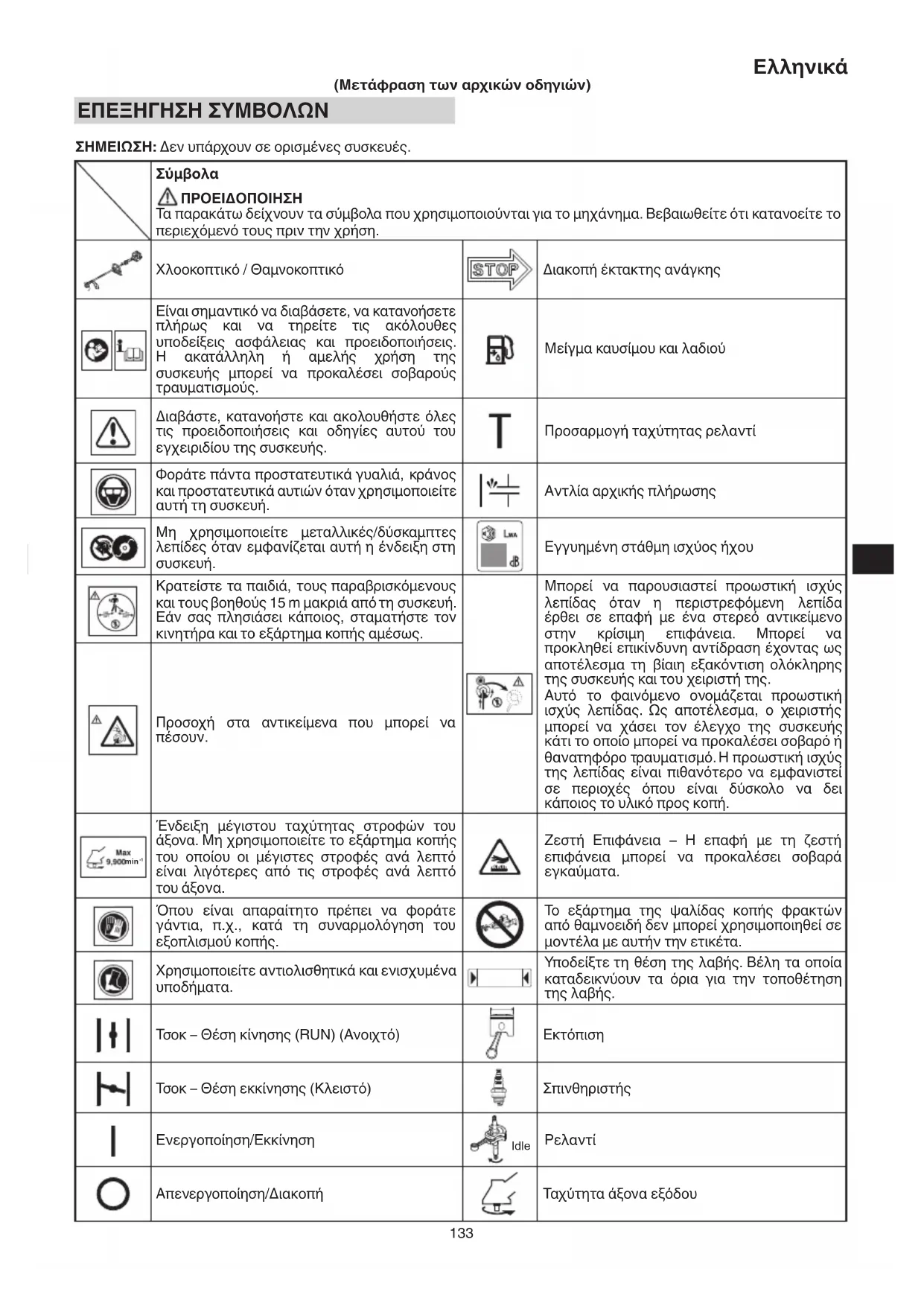 ΠΡΟΕΙΔΟΠΟΙΗΣΗ Τα παρακάτω δείχνουν τα σύμβολα που χρησιμοποιούνται για το μηχάνημα. Βεβαιωθείτε ότι κατανοείτε το περιεχόμενό τους πριν την χρήση. Χλοοκοπτικό / Θαμνοκοπτικό Διακοπή έκτακτης ανάγκης Είναι σημαντικό να διαβάσετε, να κατανοήσετε πλήρως και να τηρείτε τις ακόλουθες υποδείξεις ασφάλειας και προειδοποιήσεις. Η ακατάλληλη ή αμελής χρήση της συσκευής μπορεί να προκαλέσει σοβαρούς τραυματισμούς. Μείγμα καυσίμου και λαδιού Διαβάστε, κατανοήστε και ακολουθήστε όλες τις προειδοποιήσεις και οδηγίες αυτού του εγχειριδίου της συσκευής. Προσαρμογή ταχύτητας ρελαντί Φοράτε πάντα προστατευτικά γυαλιά, κράνος και προστατευτικά αυτιών όταν χρησιμοποιείτε αυτή τη συσκευή. Αντλία αρχικής πλήρωσης Μη χρησιμοποιείτε μεταλλικές/δύσκαμπτες λεπίδες όταν εμφανίζεται αυτή η ένδειξη στη