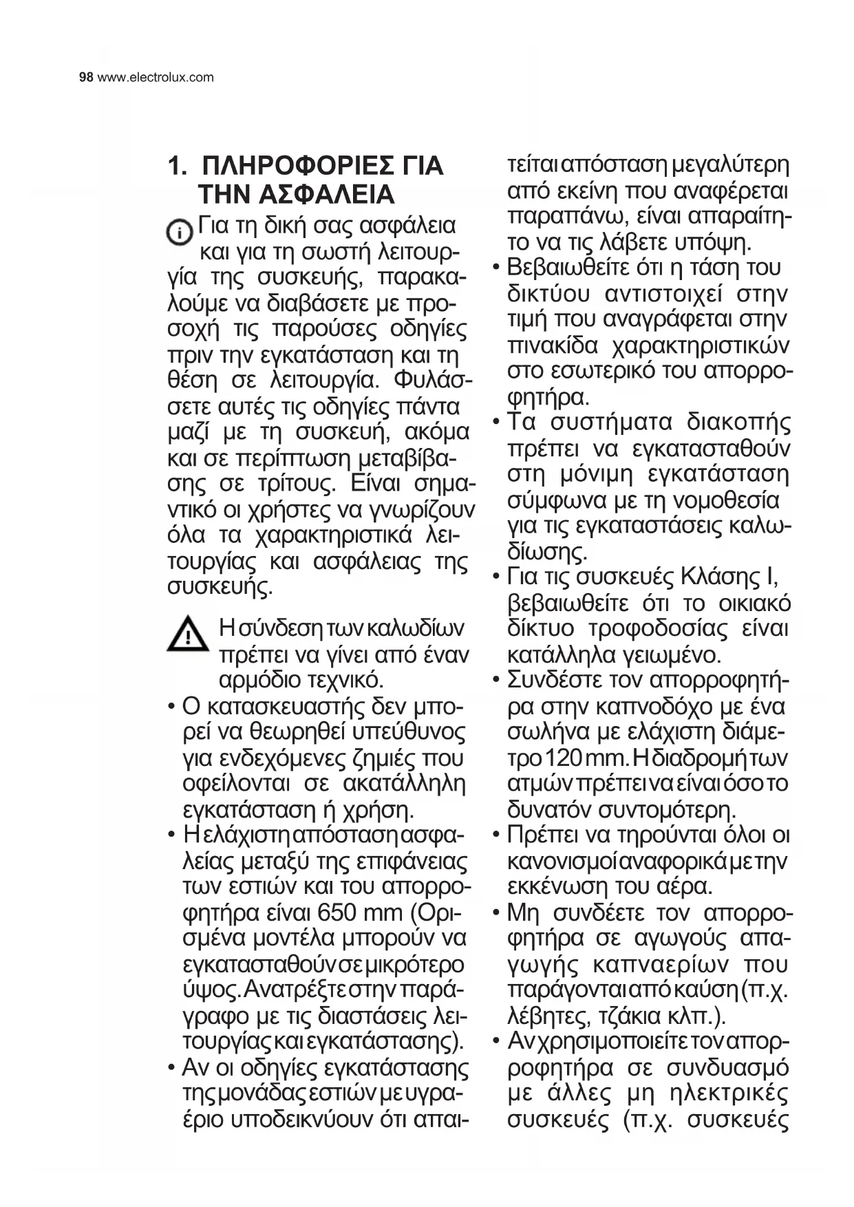 - Πρέπει να υπάρχει κατάλ- ληλος αερισμός στο χώρο όταν ο απορροφητήρας χρησιμοποιείται ταυτόχρονα με συσκευές που χρησιμο- ποιούν αέριο ή άλλα καύσιμα (δεν ισχύει για συσκευές που απάγουν αποκλειστικά τον αέρα στο χώρο).