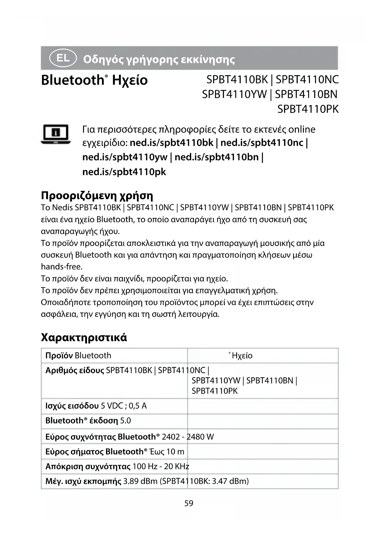 SPBT4110PK Για περισσότερες πληροφορίες δείτε το εκτενές online εγχειρίδιο: ned.is/spbt4110bk | ned.is/spbt4110nc | ned.is/spbt4110yw | ned.is/spbt4110bn | ned.is/spbt4110pk Προοριζόμενη χρήση Το Nedis SPBT4110BK | SPBT4110NC | SPBT4110YW | SPBT4110BN | SPBT4110PK είναι ένα ηχείο Bluetooth, το οποίο αναπαράγει ήχο από τη συσκευή σας αναπαραγωγής ήχου. Το προϊόν προορίζεται αποκλειστικά για την αναπαραγωγή μουσικής από μία συσκευή Bluetooth και για απάντηση και πραγματοποίηση κλήσεων μέσω hands-free. Το προϊόν δεν είναι παιχνίδι, προορίζεται για ηχείο. Το προϊόν δεν πρέπει χρησιμοποιείται για επαγγελματική χρήση. Οποιαδήποτε τροποποίηση του προϊόντος μπορεί να έχει επιπτώσεις στην ασφάλεια, την εγγύηση και τη σωστή λειτουργία. Χαρακτηριστικά Προϊόν Bluetooth