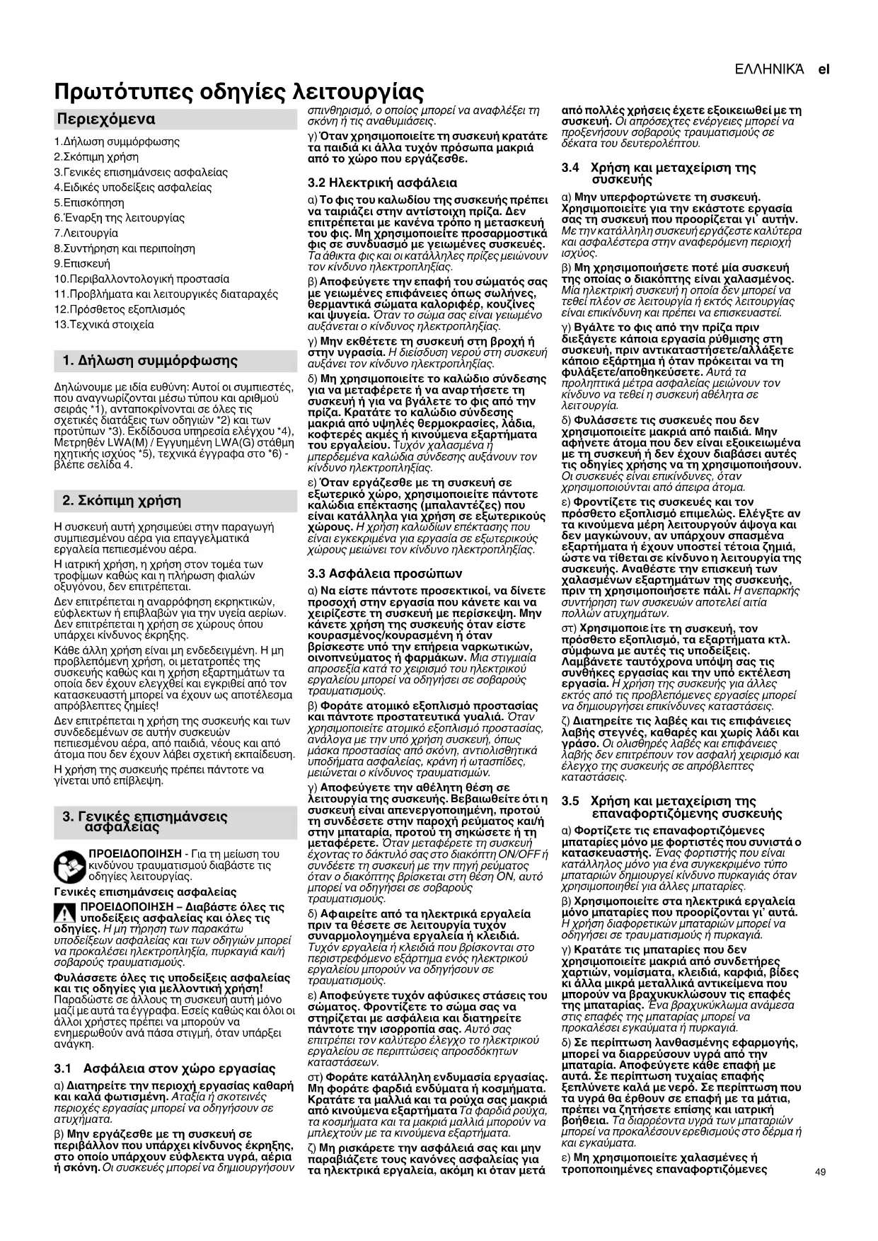 (αναλόγως του μοντέλου) Διαβάστε τις οδηγίες λειτουργίας. Προειδοποίηση για τραυματισμούς από άγγιγμα θερμών εξαρτημάτων. Φοράτε προστατευτικά γυαλιά Χρησιμοποιείτε προστασία ακοής (ωτασπίδες). Προειδοποίηση από ενδεχόμενη αυτόματη εκκίνηση. Προειδοποίηση από επικίνδυνη ηλεκτρική τάση. Εγγυημένη στάθμη ηχητικής απόδοσης.
