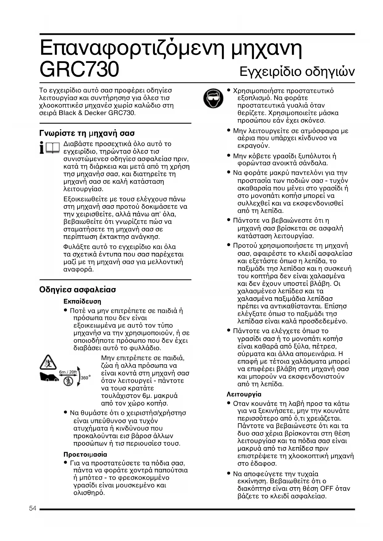 Brian Cooke Engenheiro Responsável Spennymoor, County Durham DL16 6JG United Kingdom54 Eπαναφορτιζµενη µηχανη GRC730 Tο εγχειρίδιο αυτ σασ προφέρει οδηγίεσ λειτουργίασ και συντήρησησ για λεσ τισ χλοοκοπτικέσ µηχανέσ χωρίσ καλώδιο στη σειρά Black & Decker GRC730. Γνωρίστε τη µηχανή σασ ∆ιαβάστε προσεχτικά λο αυτ το εγχειρίδιο, τηρώντασ λεσ τισ συνιστώµενεσ οδηγίεσ ασφαλείασ πριν, κατά τη διάρκεια και µετά απ τη χρήση τησ µηχανήσ σασ, και διατηρείτε τη µηχανή σασ σε καλή κατάσταση λειτουργίασ. Eξοικειωθείτε µε τουσ ελέγχουσ πάνω στη µηχανή σασ προτού δοκιµάσετε να την χειρισθείτε, αλλά πάνω απ’ λα, βεβαιωθείτε τι γνωρίζετε πώσ να σταµατήσετε τη µηχανή σασ σε περίπτωση έκτακτησ ανάγκησ. Φυλάξτε αυτ το εγχειρίδιο και λα τα σχετικά έντυπα που σασ παρέχεται µαζί µε τη µηχανή σασ για µελλοντική