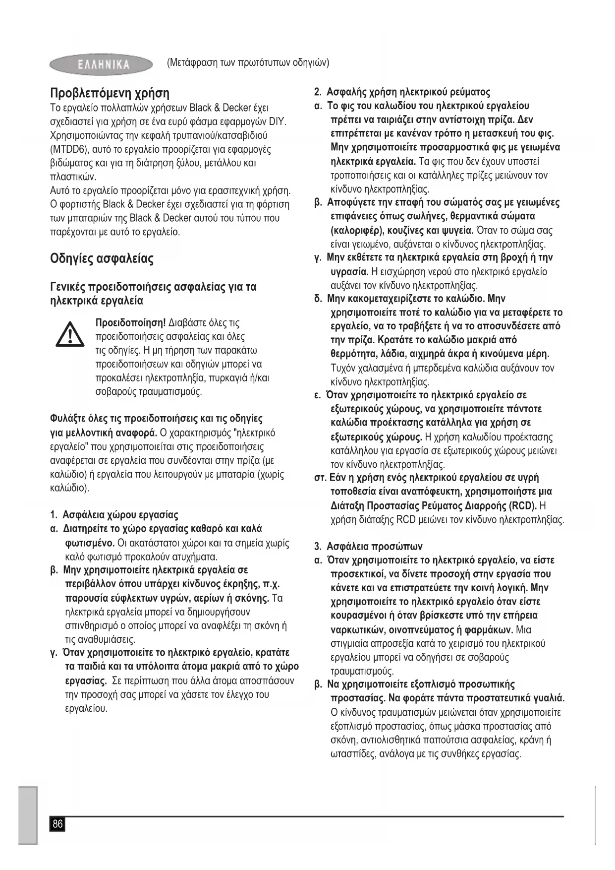 Αυτό το εργαλείο προορίζεται μόνο για ερασιτεχνική χρήση. Ο φορτιστής Black & Decker έχει σχεδιαστεί για τη φόρτιση των μπαταριών της Black & Decker αυτού του τύπου που παρέχονται με αυτό το εργαλείο. Οδηγίες ασφαλείας Γενικές προειδοποιήσεις ασφαλείας για τα ηλεκτρικά εργαλεία