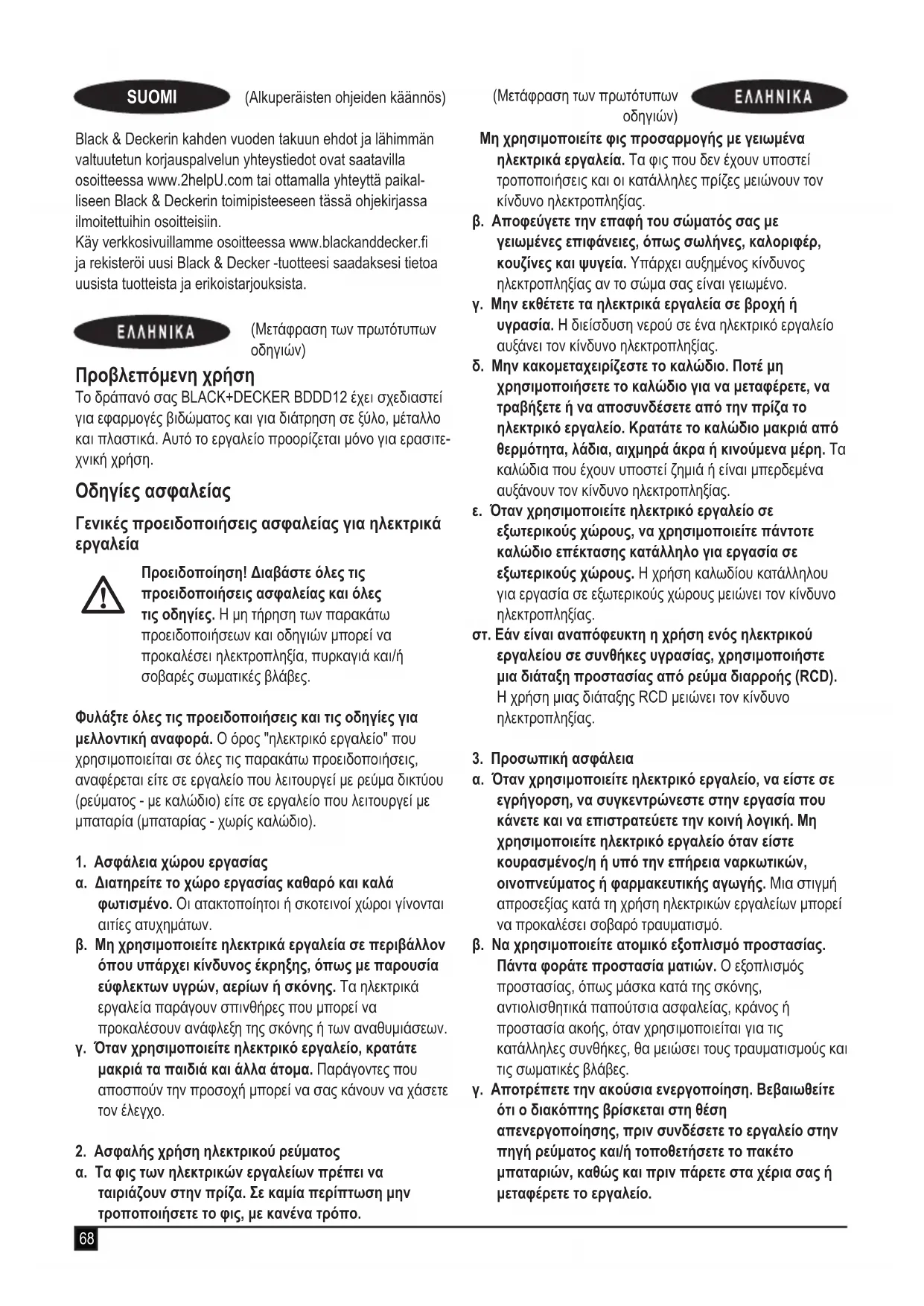Προβλεπόμενη χρήση Το δράπανό σας BLACK+DECKER BDDD12 έχει σχεδιαστεί για εφαρμογές βιδώματος και για διάτρηση σε ξύλο, μέταλλο και πλαστικά. Αυτό το εργαλείο προορίζεται μόνο για ερασιτε- χνική χρήση. Οδηγίες ασφαλείας Γενικές προειδοποιήσεις ασφαλείας για ηλεκτρικά
