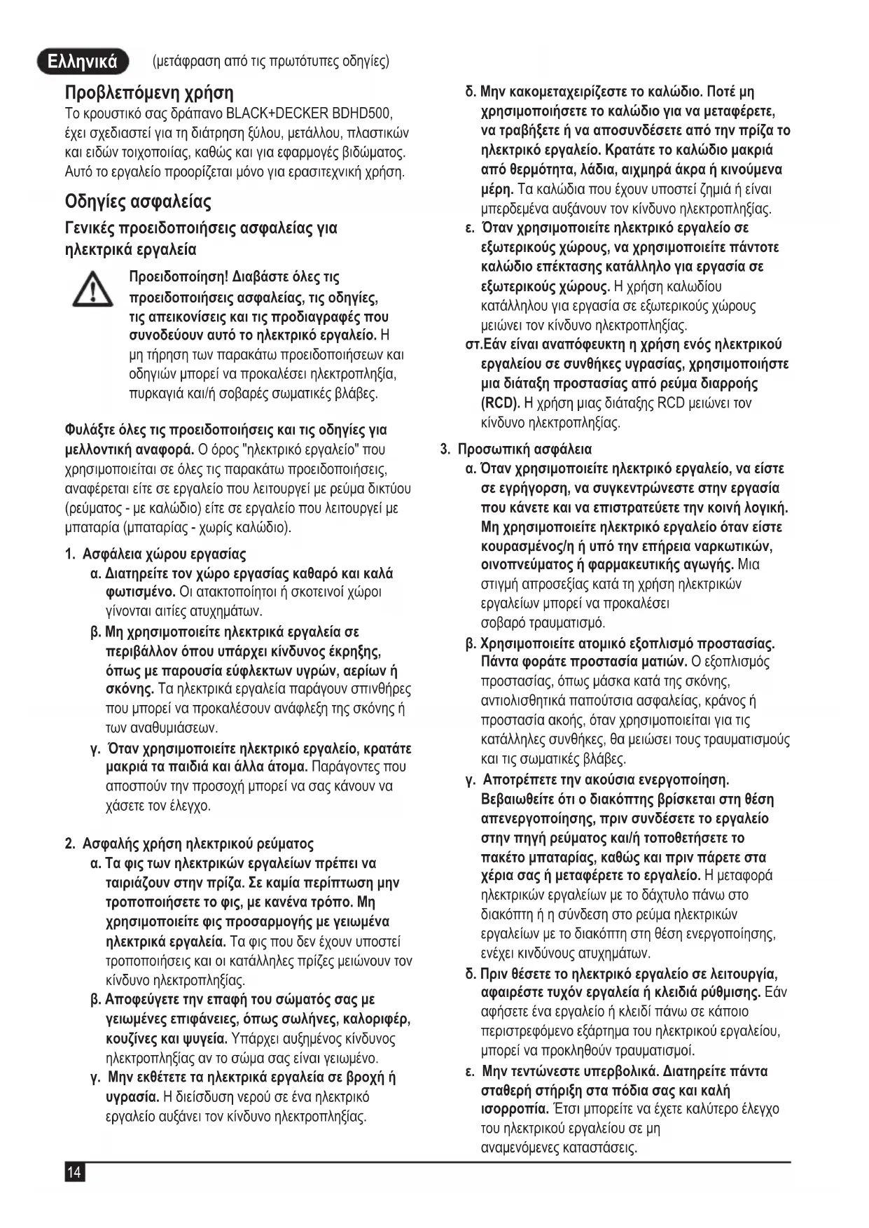 (μετάφραση από τις πρωτότυπες οδηγίες) Ελληνικά (μετάφραση από τις πρωτότυπες οδηγίες) Προβλεπόμενη χρήση Το κρουστικό σας δράπανο BLACK+DECKER BDHD500, έχει σχεδιαστεί για τη διάτρηση ξύλου, μετάλλου, πλαστικών και ειδών τοιχοποιίας, καθώς και για εφαρμογές βιδώματος. Αυτό το εργαλείο προορίζεται μόνο για ερασιτεχνική χρήση. Οδηγίες ασφαλείας Γενικές προειδοποιήσεις ασφαλείας για ηλεκτρικά εργαλεία Προειδοποίηση! Διαβάστε όλες τις προειδοποιήσεις ασφαλείας, τις οδηγίες, τις απεικονίσεις και τις προδιαγραφές που συνοδεύουν αυτό το ηλεκτρικό εργαλείο. Η μη τήρηση των παρακάτω προειδοποιήσεων και οδηγιών μπορεί να προκαλέσει ηλεκτροπληξία, πυρκαγιά και/ή σοβαρές σωματικές βλάβες. Φυλάξτε όλες τις προειδοποιήσεις και τις οδηγίες για μελλοντική αναφορά. Ο όρος "ηλεκτρικό εργαλείο" που χρησιμοποιείται σε όλες τις παρακάτω προειδοποιήσεις, αναφέρεται είτε σε εργαλείο που λειτουργεί με ρεύμα δικτύου (ρεύματος - με καλώδιο) είτε σε εργαλείο που λειτουργεί με μπαταρία (μπαταρίας - χωρίς καλώδιο).