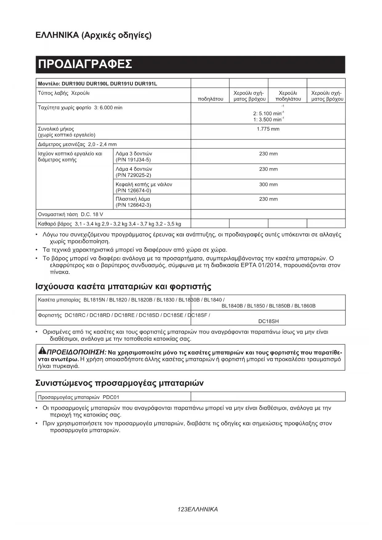Διάμετροςμεσινέζας 2,0 - 2,4 mm Ισχύονκοπτικόεργαλείοκαι διάμετροςκοπής Λάμα3δοντιών (P/N 191J34-5) 230 mm Λάμα4δοντιών (P/N 729025-2) 230 mm Κεφαλήκοπήςμενάιλον (P/N 126674-0) 300 mm Πλαστικήλάμα (P/N 126642-3) 230 mm Ονομαστικήτάση D.C. 18 V Καθαρόβάρος 3,1 - 3,4 kg 2,9 - 3,2 kg 3,4 - 3,7 kg 3,2 - 3,5 kg