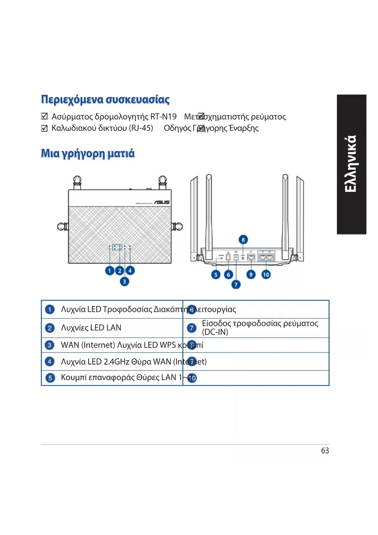 Μια γρήγορη ματιά Περιεχόμενα συσκευασίας Ασύρματος δρομολογητής RT-N19 Μετασχηματιστής ρεύματος Καλωδιακού δικτύου (RJ-45) Οδηγός Γρήγορης Έναρξης Λυχνία LED Τροφοδοσίας Διακόπτης λειτουργίας Λυχνίες LED LAN Είσοδος τροφοδοσίας ρεύματος (DC-IN) WAN (Internet) Λυχνία LED WPS κουμπί Λυχνία LED 2.4GHz Θύρα WAN (Internet) Κουμπί επαναφοράς Θύρες LAN 1~2 Ελληνικά64