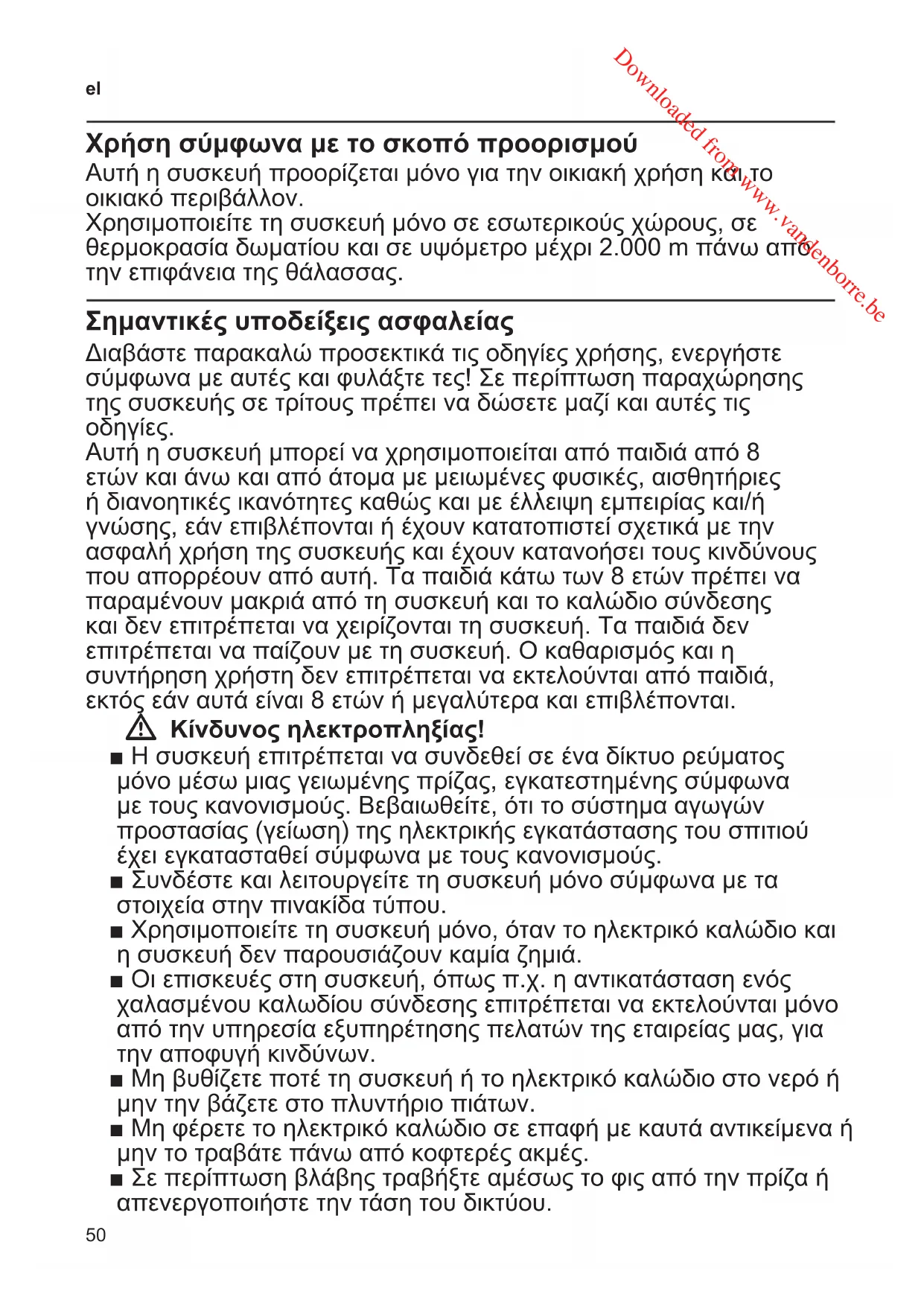 Αυτή η συσκευή μπορεί να χρησιμοποιείται από παιδιά από 8 ετών και άνω και από άτομα με μειωμένες φυσικές, αισθητήριες ή διανοητικές ικανότητες καθώς και με έλλειψη εμπειρίας και/ή γνώσης, εάν επιβλέπονται ή έχουν κατατοπιστεί σχετικά με την ασφαλή χρήση της συσκευής και έχουν κατανοήσει τους κινδύνους που απορρέουν από αυτή. Τα παιδιά κάτω των 8 ετών πρέπει να παραμένουν μακριά από τη συσκευή και το καλώδιο σύνδεσης και δεν επιτρέπεται να χειρίζονται τη συσκευή. Τα παιδιά δεν επιτρέπεται να παίζουν με τη συσκευή. Ο καθαρισμός και η συντήρηση χρήστη δεν επιτρέπεται να εκτελούνται από παιδιά, εκτός εάν αυτά είναι 8 ετών ή μεγαλύτερα και επιβλέπονται. W Κίνδυνος ηλεκτροπληξίας! ■ Η συσκευή επιτρέπεται να συνδεθεί σε ένα δίκτυο ρεύματος μόνο μέσω μιας γειωμένης πρίζας, εγκατεστημένης σύμφωνα με τους κανονισμούς. Βεβαιωθείτε, ότι το σύστημα αγωγών προστασίας (γείωση) της ηλεκτρικής εγκατάστασης του σπιτιού έχει εγκατασταθεί σύμφωνα με τους κανονισμούς. ■ Συνδέστε και λειτουργείτε τη συσκευή μόνο σύμφωνα με τα στοιχεία στην πινακίδα τύπου. ■ Χρησιμοποιείτε τη συσκευή μόνο, όταν το ηλεκτρικό καλώδιο και η συσκευή δεν παρουσιάζουν καμία ζημιά. ■ Οι επισκευές στη συσκευή, όπως π.χ. η αντικατάσταση ενός χαλασμένου καλωδίου σύνδεσης επιτρέπεται να εκτελούνται μόνο από την υπηρεσία εξυπηρέτησης πελατών της εταιρείας μας, για την αποφυγή κινδύνων. ■ Μη βυθίζετε ποτέ τη συσκευή ή το ηλεκτρικό καλώδιο στο νερό ή μην την βάζετε στο πλυντήριο πιάτων. ■ Μη φέρετε το ηλεκτρικό καλώδιο σε επαφή με καυτά αντικείμενα ή μην το τραβάτε πάνω από κοφτερές ακμές. ■ Σε περίπτωση βλάβης τραβήξτε αμέσως το φις από την πρίζα ή απενεργοποιήστε την τάση του δικτύου. Downloaded from www.vandenborre.be51