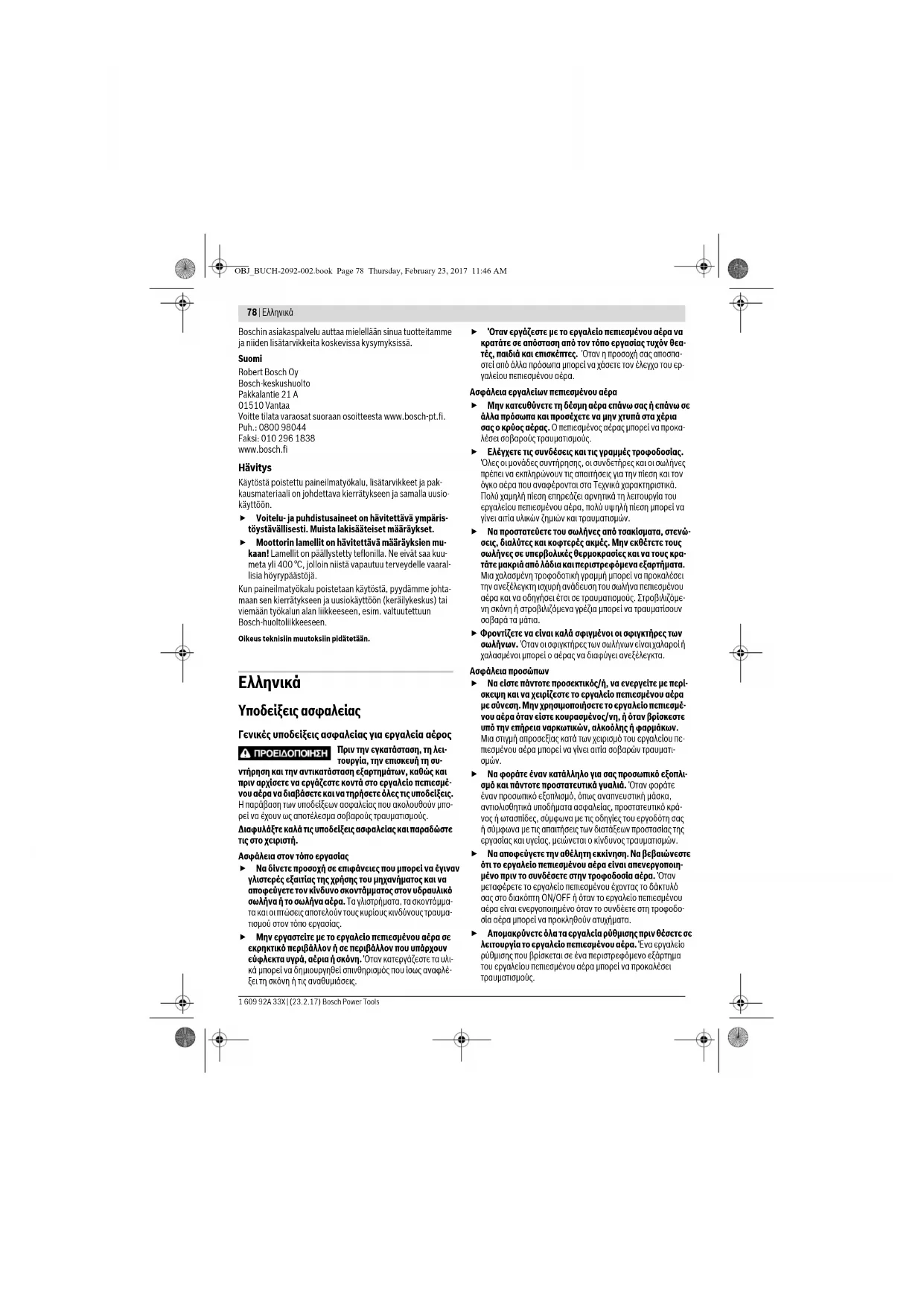 Να διατηρείτε τα κοπτικά εργαλεία κοφτερά και καθαρά. Επιμελώς συντηρημένα κοπτικά εργαλεία με κοφτερές ακ- μές σφηνώνουν δυσκολότερα και οδηγούνται ευκολότερα. Να χρησιμοποιείτε το εργαλείο πεπιεσμένου αέρα, τα εξαρτήματα, τα εργαλεία κτλ. σύμφωνα με τις παρούσες οδηγίες. Συμπληρωματικά να λαμβάνετε υπόψη σας και τις εκάστοτε συνθήκες εργασίας και την υπό εκτέλεση εργασία. Έτσι περιορίζονται κατά το δυνατό η δημιουργία σκόνης, οι κραδασμοί και εκπομπή θορύβων. Το εργαλείο πεπιεσμένου αέρα πρέπει να συναρμολογη- θεί, να ρυθμιστεί και να χρησιμοποιείται αποκλειστικά από κατάλληλα εκπαιδευμένο προσωπικό. Δεν επιτρέπεται η μετατροπή του εργαλείου πεπιεσμέ- νου αέρα. Τυχόν μετατροπές μπορεί να ελαττώσουν την αποτελεσματικότητα των μέτρων ασφαλείας και να αυξή- σουν του κινδύνους για το χειριστή. Service Να δίνετε το εργαλείο αέρος για επισκευή από άριστα εκπαιδευμένο ειδικό προσωπικό και με γνήσια αντ- αλλακτικά. Έτσι εξασφαλίζετε τη διατήρηση της ασφάλειας του εργαλείου αέρος. Υποδείξεις ασφαλείας για περιστροφικά πιστολέ- τα πεπιεσμένου αέρα Βεβαιωθείτε ότι η πινακίδα του κατασκευαστή είναι ευ- ανάγνωστη. Αν χρειαστεί ζητήστε από τον κατασκευαστή μια καινούρια πινακίδα. Σε περίπτωση θραύσης του υπό κατεργασία τεμαχίου, ενός εξαρτήματος ή ακόμη και του ίδιου του εργαλείου πεπιεσμένου αέρα μπορεί τα θραύσματα να εκσφενδο- νιστούν με μεγάλη ταχύτητα. Όταν εργάζεστε καθώς και όταν επισκευάζετε, συντη- ρείτε, ή αντικαθιστάτε εξαρτήματα του εργαλείου πεπιε- σμένου αέρα πρέπει να προστατεύετε τα μάτια σας πά- ντοτε αποτελεσματικά με κατάλληλες διατάξεις. Ο βαθ- μός προστασίας πρέπει να εκτιμάται ξεχωριστά για την εκάστοτε υπό εκτέλεση εργασία. Να φοράτε κράνος όταν εργάζεστε υπεράνω του κεφα- λιού σας. Έτσι προστατεύεστε από τραυματισμούς. Να χρησιμοποιείτε το εργαλείο πεπιεσμένου αέρα μόνο όταν το καλέμι έχει εξασφαλιστεί από χαλάρωμα και λύ- σιμο. Διαφορετικά το εργαλείο μπορεί να εκσφενδονιστεί ανεξέλεγκτα. Φθαρμένα, στρεβλωμένα ή σπασμένα εξαρτήματα της υποδοχής εργαλείου πρέπει να αντικαθίστανται. Έτσι προστατεύεστε από τραυματισμούς. Να τοποθετείτε το εργαλείο πεπιεσμένου αέρα γερά επάνω στην υπό επεξεργασία επιφάνεια πριν το θέσετε σε λειτουργία. Ο χειριστής και το προσωπικό συντήρησης πρέπει να εί- ναι σε θέση να ανταπεξέρχονται στο μέγεθος, το βάρος κα την ισχύ του εργαλείου πεπιεσμένου αέρα. OBJ_BUCH-2092-002.book Page 79 Thursday, February 23, 2017 11:46 AM80 | Ελληνικά 1 609 92A 33X | (23.2.17) Bosch Power Tools Να υπολογίζετε πάντοτε με αναπάντεχες κινήσεις του εργαλείου πεπιεσμένου αέρα που μπορούν να προκλη- θούν από κλότσημα ή από θραύση του εργαλείου. Να κρατάτε το εργαλείο πεπιεσμένου αέρα γερά και να παίρνετε με το σώμα σας και τα χέρα σας θέσεις στις οποίες θα μπορέσετε να ανταπεξέλθετε στις κινήσεις αυτές. Αυτά τα προληπτικά μέτρα συμβάλλουν στην προστα- σία από τραυματισμούς. Προσοχή! Όταν εργάζεστε για πολλή ώρα τα εργαλεία μπορεί να θερμανθούν υπερβολικά. Να φοράτε προστα- τευτικά γάντια. Θέστε τα εργαλείο πεπιεσμένου αέρα εκτός λειτουργίας όταν διακοπεί η παροχή πεπιεσμένου αέρα ή όταν πέσει η πίεση λειτουργίας. Ελέγξτε την πίεση λειτουργίας και ξε- κινήστε πάλι με την ιδανική πίεση λειτουργίας. Κατά την εκτέλεση των διαφόρων εργασιών με το εργα- λείο πεπιεσμένου αέρα ο χειριστής του εργαλείου πεπι- εσμένου αέρα μπορεί να αισθανθεί διάφορα δυσάρεσ