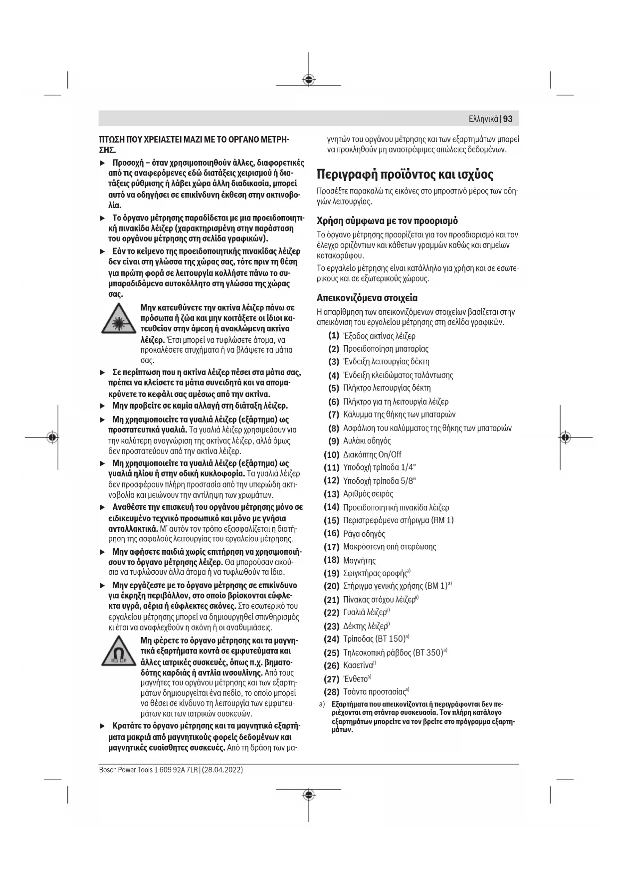 u Σε περίπτωση που η ακτίνα λέιζερ πέσει στα μάτια σας, πρέπει να κλείσετε τα μάτια συνειδητά και να απομα- κρύνετε το κεφάλι σας αμέσως από την ακτίνα. u Μην προβείτε σε καμία αλλαγή στη διάταξη λέιζερ.u Μη χρησιμοποιείτε τα γυαλιά λέιζερ (εξάρτημα) ως προστατευτικά γυαλιά. Τα γυαλιά λέιζερ χρησιμεύουν για την καλύτερη αναγνώριση της ακτίνας λέιζερ, αλλά όμως δεν προστατεύουν από την ακτίνα λέιζερ. u Μη χρησιμοποιείτε τα γυαλιά λέιζερ (εξάρτημα) ως γυαλιά ηλίου ή στην οδική κυκλοφορία. Τα γυαλιά λέιζερ δεν προσφέρουν πλήρη προστασία από την υπεριώδη ακτι- νοβολία και μειώνουν την αντίληψη των χρωμάτων. u Αναθέστε την επισκευή του οργάνου μέτρησης μόνο σε ειδικευμένο τεχνικό προσωπικό και μόνο με γνήσια ανταλλακτικά. Μ’ αυτόν τον τρόπο εξασφαλίζεται η διατή- ρηση της ασφαλούς λειτουργίας του εργαλείου μέτρησης. u Μην αφήσετε παιδιά χωρίς επιτήρηση να χρησιμοποιή- σουν το όργανο μέτρησης λέιζερ. Θα μπορούσαν ακού- σια να τυφλώσουν άλλα άτομα ή να τυφλωθούν τα ίδια. u Μην εργάζεστε με το όργανο μέτρησης σε επικίνδυνο για έκρηξη περιβάλλον, στο οποίο βρίσκονται εύφλε- κτα υγρά, αέρια ή εύφλεκτες σκόνες. Στο εσωτερικό του εργαλείου μέτρησης μπορεί να δημιουργηθεί σπινθηρισμός κι έτσι να αναφλεχθούν η σκόνη ή οι αναθυμιάσεις. Μη φέρετε το όργανο μέτρησης και τα μαγνη- τικά εξαρτήματα κοντά σε εμφυτεύματα και άλλες ιατρικές συσκευές, όπως π.χ. βηματο- δότης καρδιάς ή αντλία ινσουλίνης. Από τους μαγνήτες του οργάνου μέτρησης και των εξαρτη- μάτων δημιουργείται ένα πεδίο, το οποίο μπορεί να θέσει σε κίνδυνο τη λειτουργία των εμφυτευ- μάτων και των ιατρικών συσκευών. u Κρατάτε το όργανο μέτρησης και τα μαγνητικά εξαρτή- ματα μακριά από μαγνητικούς φορείς δεδομένων και μαγνητικές ευαίσθητες συσκευές. Από τη δράση των μα- γνητών του οργάνου μέτρησης και των εξαρτημάτων μπορεί να προκληθούν μη αναστρέψιμες απώλειες δεδομένων. Περιγραφή προϊόντος και ισχύος Προσέξτε παρακαλώ τις εικόνες στο μπροστινό μέρος των οδη- γιών λειτουργίας. Χρήση σύμφωνα με τον προορισμό Το όργανο μέτρησης προορίζεται για τον προσδιορισμό και τον έλεγχο οριζόντιων και κάθετων γραμμών καθώς και σημείων κατακορύφου. Το εργαλείο μέτρησης είναι κατάλληλο για χρήση και σε εσωτε- ρικούς και σε εξωτερικούς χώρους. Απεικονιζόμενα στοιχεία Η απαρίθμηση των απεικονιζόμενων στοιχείων βασίζεται στην απεικόνιση του εργαλείου μέτρησης στη σελίδα γραφικών. (1) Έξοδος ακτίνας λέιζερ (2) Προειδοποίηση μπαταρίας (3) Ένδειξη λειτουργίας δέκτη (4) Ένδειξη κλειδώματος ταλάντωσης (5) Πλήκτρο λειτουργίας δέκτη (6) Πλήκτρο για τη λειτουργία λέιζερ (7) Κάλυμμα της θήκης των μπαταριών (8) Ασφάλιση του καλύμματος της θήκης των μπαταριών (9) Αυλάκι οδηγός (10) Διακόπτης On/Off (11) Υποδοχή τρίποδα 1/4" (12) Υποδοχή τρίποδα 5/8" (13) Αριθμός σειράς (14) Προειδοποιητική πινακίδα λέιζερ (15) Περιστρεφόμενο στήριγμα (RM1) (16) Ράγα οδηγός (17) Μακρόστενη οπή στερέωσης (18)