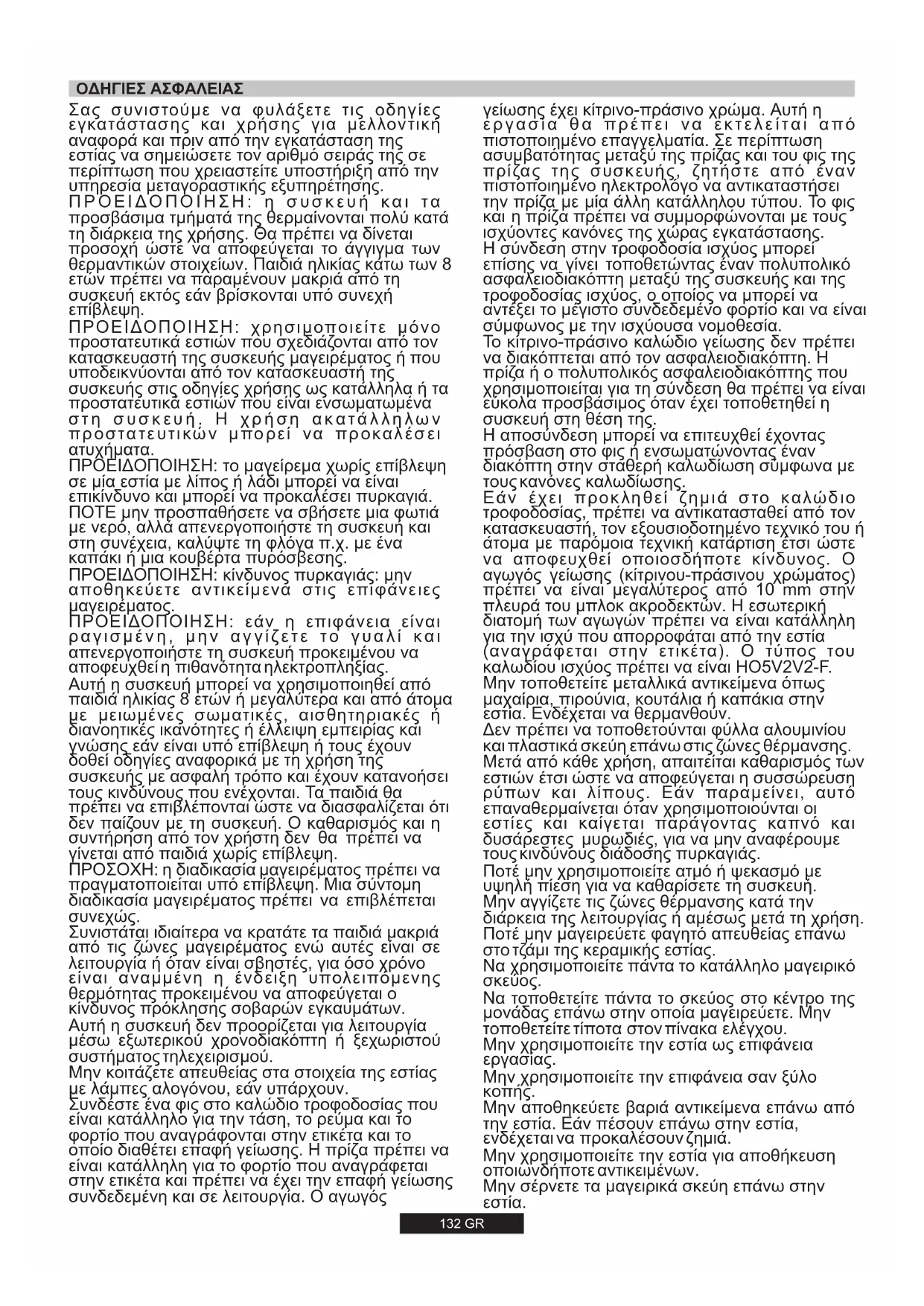 Ποτέ μην χρησιμοποιείτε ατμό ή ψεκασμό με υψηλή πίεση για να καθαρίσετε τη συσκευή. Η σύνδεση στην τροφοδοσία ισχύος μπορεί επίσης να γίνει τοποθετώντας έναν πολυπολικό ασφαλειοδιακόπτη μεταξύ της συσκευής και της τροφοδοσίας ισχύος, ο οποίος να μπορεί να αντέξει το μέγιστο συνδεδεμένο φορτίο και να είναι σύμφωνος με την ισχύουσα νομοθεσία. Το κίτρινο-πράσινο καλώδιο γείωσης δεν πρέπει να διακόπτεται από τον ασφαλειοδιακόπτη. Η πρίζα ή ο πολυπολικός ασφαλειοδιακόπτης που χρησιμοποιείται για τη σύνδεση θα πρέπει να είναι εύκολα προσβάσιμος όταν έχει τοποθετηθεί η συσκευή στη θέση της. Η αποσύνδεση μπορεί να επιτευχθεί έχοντας πρόσβαση στο φις ή ενσωματώνοντας έναν διακόπτη στην σταθερή καλωδίωση σύμφωνα με τους κανόνες καλωδίωσης. Μην τοποθετείτε μεταλλικά αντικείμενα όπως μαχαίρια, πιρούνια, κουτάλια ή καπάκια στην εστία. Ενδέχεται να θερμανθούν. Δεν πρέπει να τοποθετούνται φύλλα αλουμινίου και πλαστικά σκεύη επάνω στις ζώνες θέρμανσης. Μετά από κάθε χρήση, απαιτείται καθαρισμός των εστιών έτσι ώστε να αποφεύγεται η συσσώρευση ρύπων και λίπους. Εάν παραμείνει, αυτό επαναθερμαίνεται όταν χρησιμοποιούνται οι εστίες και καίγεται παράγοντας καπνό και δυσάρεστες μυρωδιές, για να μην αναφέρουμε τους κινδύνους διάδοσης πυρκαγιάς. Μην αγγίζετε τις ζώνες θέρμανσης κατά την διάρκεια της λειτουργίας ή αμέσως μετά τη χρήση. Ποτέ μην μαγειρεύετε φαγητό απευθείας επάνω στο τζάμι της κεραμικής εστίας. Να χρησιμοποιείτε πάντα το κατάλληλο μαγειρικό