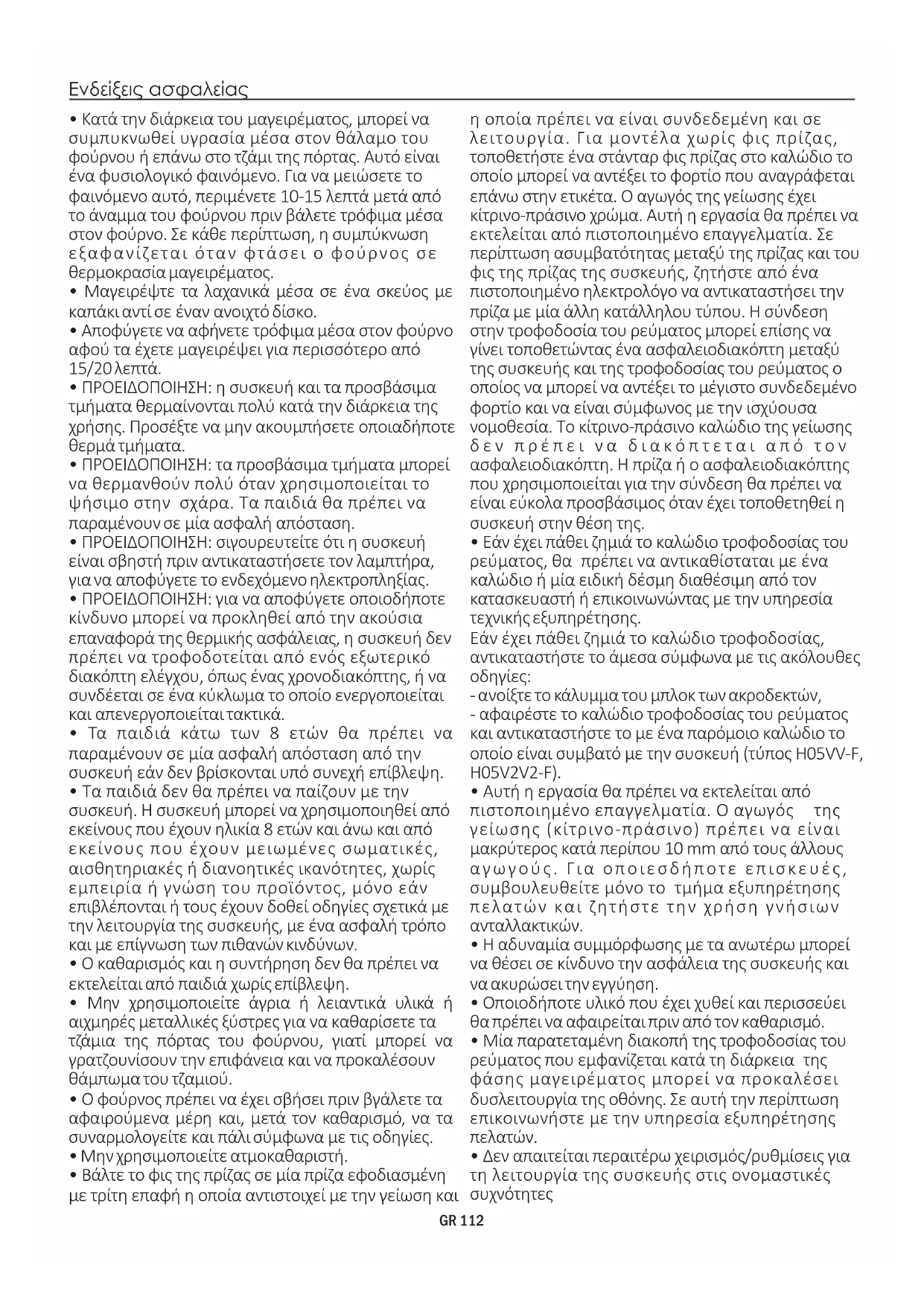 - την ρύθμιση του ασφαλειοδιακόπτη. Το καλώδιο της γείωσης που συνδέεται στον ακροδέκτη γείωσης του φούρνου πρέπει να είναι συνδεδεμένο με τον ακροδέκτη της γείωσης της παροχής ηλεκτρικού ρεύματος. ΠΡΟΕΙΔΟΠΟΙΗΣΗ Πριν συνδέσετε τον φούρνο με την παροχή ηλεκτρικού ρεύματος, ζητήστε από ένα πιστοποιημένο ηλεκτρολόγο να ελέγξει την συνέχεια του ακροδέκτη της γείωσης της παροχής ηλεκτρικού ρεύματος. Ο κατασκευαστής δεν φέρει καμία απολύτως ευθύνη για τυχόν ατυχήματα ή άλλα προβλήματα προκληθούν από την αμέλεια σύνδεσης του φούρνου με τον ακροδέκτη της γείωσης ή από μία σύνδεση με την γείωση η οποία έχει ελαττωματική συνέχεια. ΣΗΜΕΙΩΣΗ: λόγω του ότι ο φούρνος μπορεί να προϋποθέτει λειτουργία συντήρησης, καλό είναι να διατηρείτε διαθέσιμη άλλη μία πρίζα τοίχου έτσι ώστε να μπορεί να συνδεθεί σε αυτήν ο φούρνος εάν αφαιρεθεί από τον χώρο στον οποίο είναι τοποθετημένος. Το καλώδιο τροφοδοσίας πρέπει να αντικαθίσταται μόνο από προσωπικό της τεχνικής υπηρεσίας ή από τεχνικούς με αντίστοιχες πιστοποιήσεις. Όταν είναι σβηστός ο φούρνος μπορεί να υπάρχει ένα ασθενές φως γύρω από τον κεντρικό κύριο διακόπτη. Αυτό είναι απόλυτα φυσιολογικό. Μπορεί να σβήσει απλά γυρίζοντας ανάποδα την πρίζα της συσκευής ή αλλάζοντας θέση μεταξύ των ακροδεκτών τροφοδοσίας.