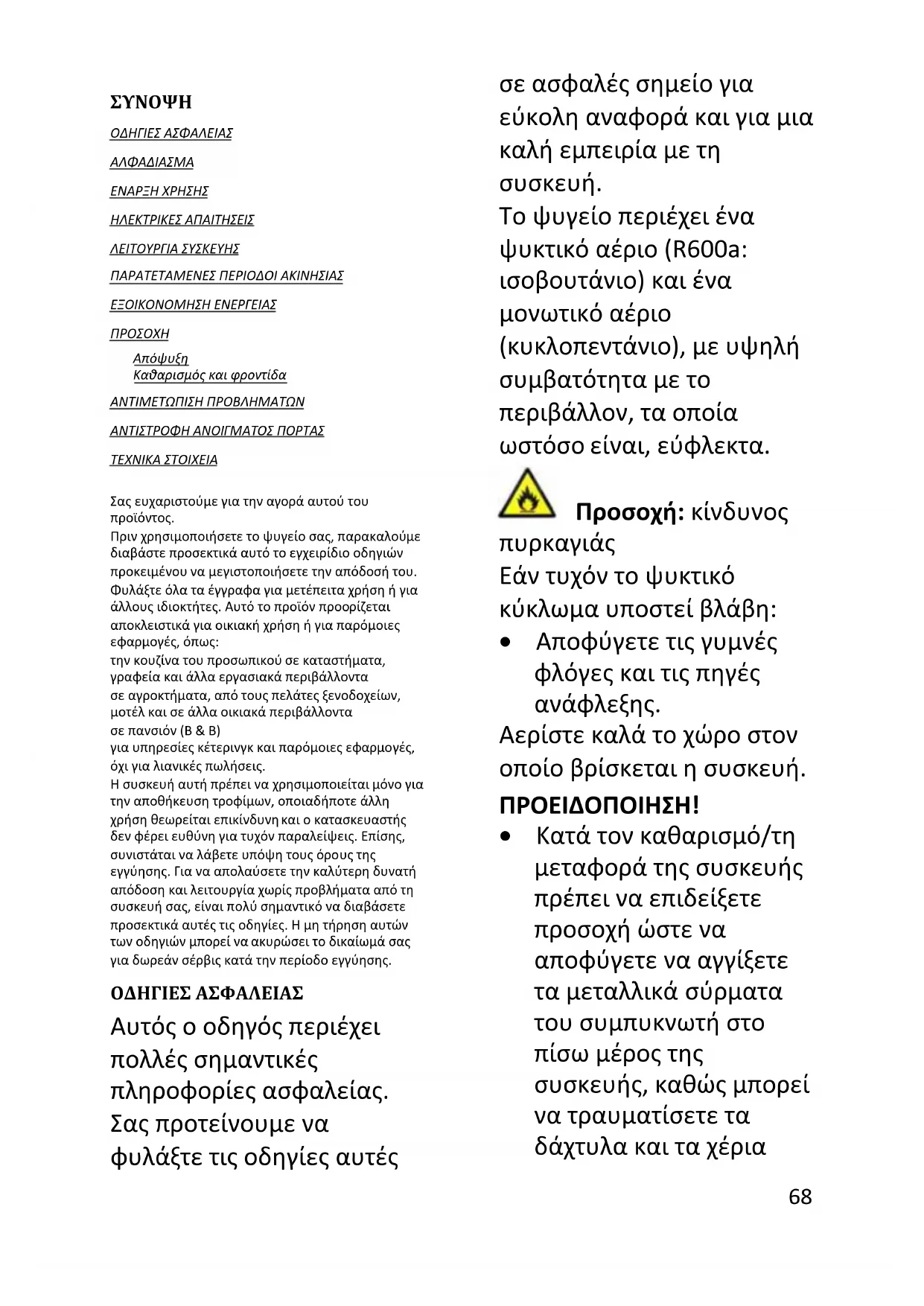 ΟΔΗΓΙΕΣ ΑΣΦΑΛΕΙΑΣ ΑΛΦΑΔΙΑΣΜΑ ΕΝΑΡΞΗ ΧΡΗΣΗΣ ΗΛΕΚΤΡΙΚΕΣ ΑΠΑΙΤΗΣΕΙΣ ΛΕΙΤΟΥΡΓΙΑ ΣΥΣΚΕΥΗΣ ΠΑΡΑΤΕΤΑΜΕΝΕΣ ΠΕΡΙΟΔΟΙ ΑΚΙΝΗΣΙΑΣ ΕΞΟΙΚΟΝΟΜΗΣΗ ΕΝΕΡΓΕΙΑΣ ΠΡΟΣΟΧΗ Απόψυξη Καθαρισμός και φροντίδα ΑΝΤΙΜΕΤΩΠΙΣΗ ΠΡΟΒΛΗΜΑΤΩΝ ΑΝΤΙΣΤΡΟΦΗ ΑΝΟΙΓΜΑΤΟΣ ΠΟΡΤΑΣ ΤΕΧΝΙΚΑ ΣΤΟΙΧΕΙΑ Σας ευχαριστούμε για την αγορά αυτού του Πριν χρησιμοποιήσετε το ψυγείο σας, παρακαλούμε διαβάστε προσεκτικά αυτό το εγχειρίδιο οδηγιών προκειμένου να μεγιστοποιήσετε την απόδοσή του. Φυλάξτε όλα τα έγγραφα για μετέπειτα χρήση ή για άλλους ιδιοκτήτες. Αυτό το προϊόν προορίζεται αποκλειστικά για οικιακή χρήση ή για παρόμοιες εφαρμογές, όπως: την κουζίνα του προσωπικού σε καταστήματα, γραφεία και άλλα εργασιακά περιβάλλοντα σε αγροκτήματα, από τους πελάτες ξενοδοχείων, μοτέλ και σε άλλα οικιακά περιβάλλοντα σε πανσιόν (B & B) για υπηρεσίες κέτερινγκ και παρόμοιες εφαρμογές, όχι για λιανικές πωλήσεις. Η συσκευή αυτή πρέπει να χρησιμοποιείται μόνο για την αποθήκευση τροφίμων, οποιαδήποτε άλλη χρήση θεωρείται επικίνδυνη και ο κατασκευαστής δεν φέρει ευθύνη για τυχόν παραλείψεις. Επίσης, συνιστάται να λάβετε υπόψη τους όρους της εγγύησης. Για να απολαύσετε την καλύτερη δυνατή απόδοση και λειτουργία χωρίς προβλήματα από τη συσκευή σας, είναι πολύ σημαντικό να διαβάσετε προσεκτικά αυτές τις οδηγίες. Η μη τήρηση αυτών των οδηγιών μπορεί να ακυρώσει το δικαίωμά σας για δωρεάν σέρβις κατά την περίοδο εγγύησης. ΟΔΗΓΙΕΣ ΑΣΦΑΛΕΙΑΣ Αυτός ο οδηγός περιέχει πολλές σημαντικές πληροφορίες ασφαλείας. Σας προτείνουμε να φυλάξτε τις οδηγίες αυτές σε ασφαλές σημείο για εύκολη αναφορά και για μια καλή εμπειρία με τη