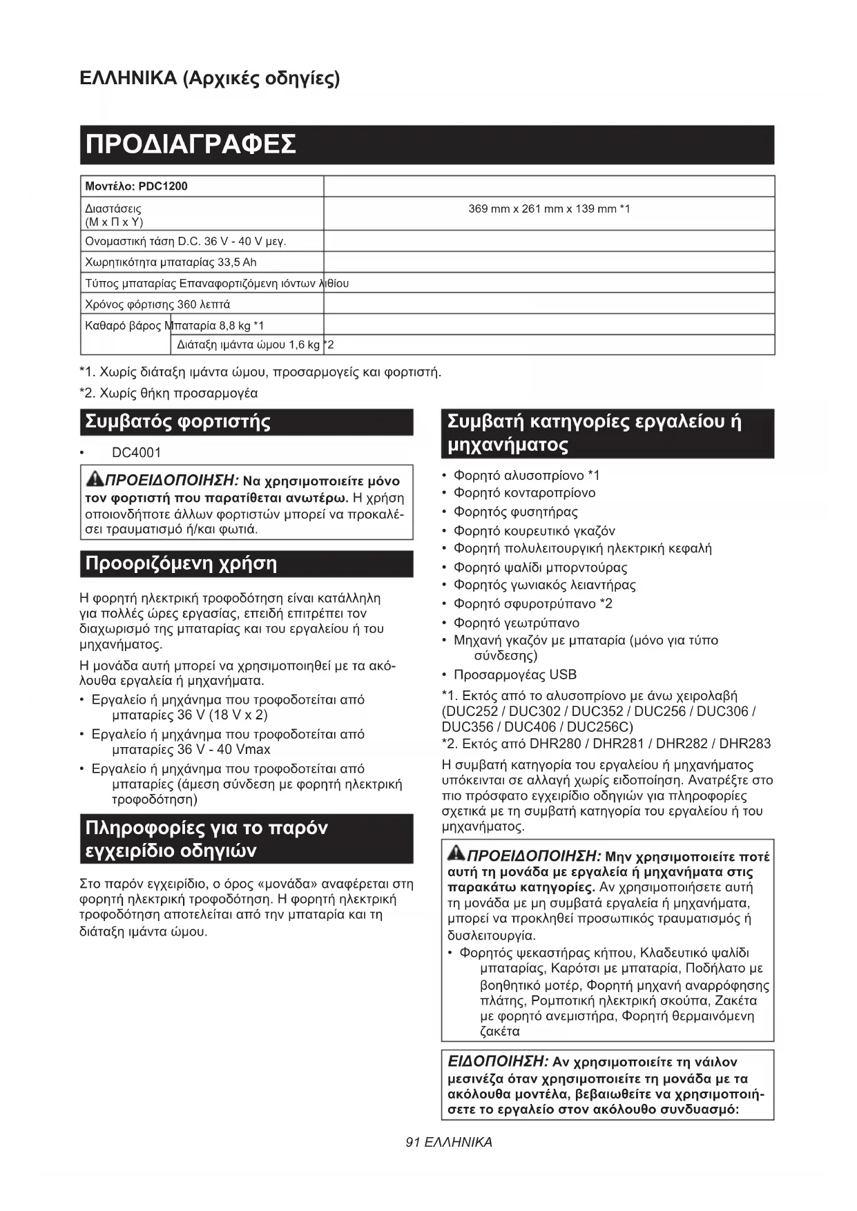 DUC356 / DUC406 / DUC256C) *2. Εκτός από DHR280 / DHR281 / DHR282 / DHR283 Η συμβατή κατηγορία του εργαλείου ή μηχανήματος υπόκεινται σε αλλαγή χωρίς ειδοποίηση. Ανατρέξτε στο πιο πρόσφατο εγχειρίδιο οδηγιών για πληροφορίες σχετικά με τη συμβατή κατηγορία του εργαλείου ή του μηχανήματος. ΠΡΟΕΙΔΟΠΟΙΗΣΗ: Μην χρησιμοποιείτε ποτέ αυτή τη μονάδα με εργαλεία ή μηχανήματα στις παρακάτω κατηγορίες. Αν χρησιμοποιήσετε αυτή τη μονάδα με μη συμβατά εργαλεία ή μηχανήματα, μπορεί να προκληθεί προσωπικός τραυματισμός ή δυσλειτουργία.
