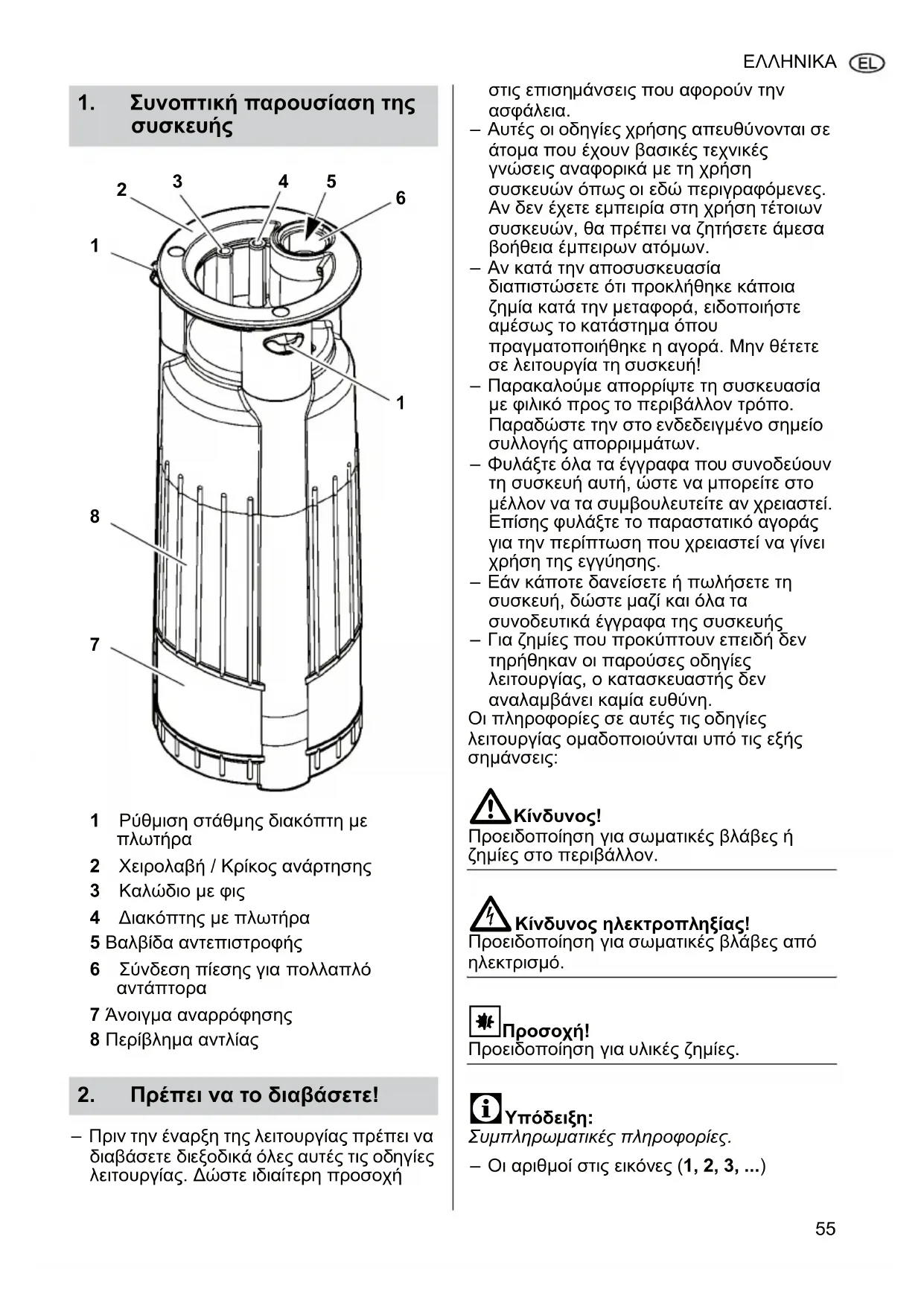 – Προσέξτε κατά τη χρήση της συσκευής τις επόμενες υποδείξεις ασφαλείας για να αποκλειστούν κίνδυνοι για τραυματισμό ή υλικές ζημιές. – Προσέξτε τις οδηγίες του νόμου ή προδιαγραφές πρόληψης ατυχημάτων για τη χρήση βυθιζόμενων αντλιών. – Κατά τη χρήση σε κολυμβητικές πισίνες και λιμνούλες κήπου και στο γύρω από αυτές πεδίο ασφαλείας