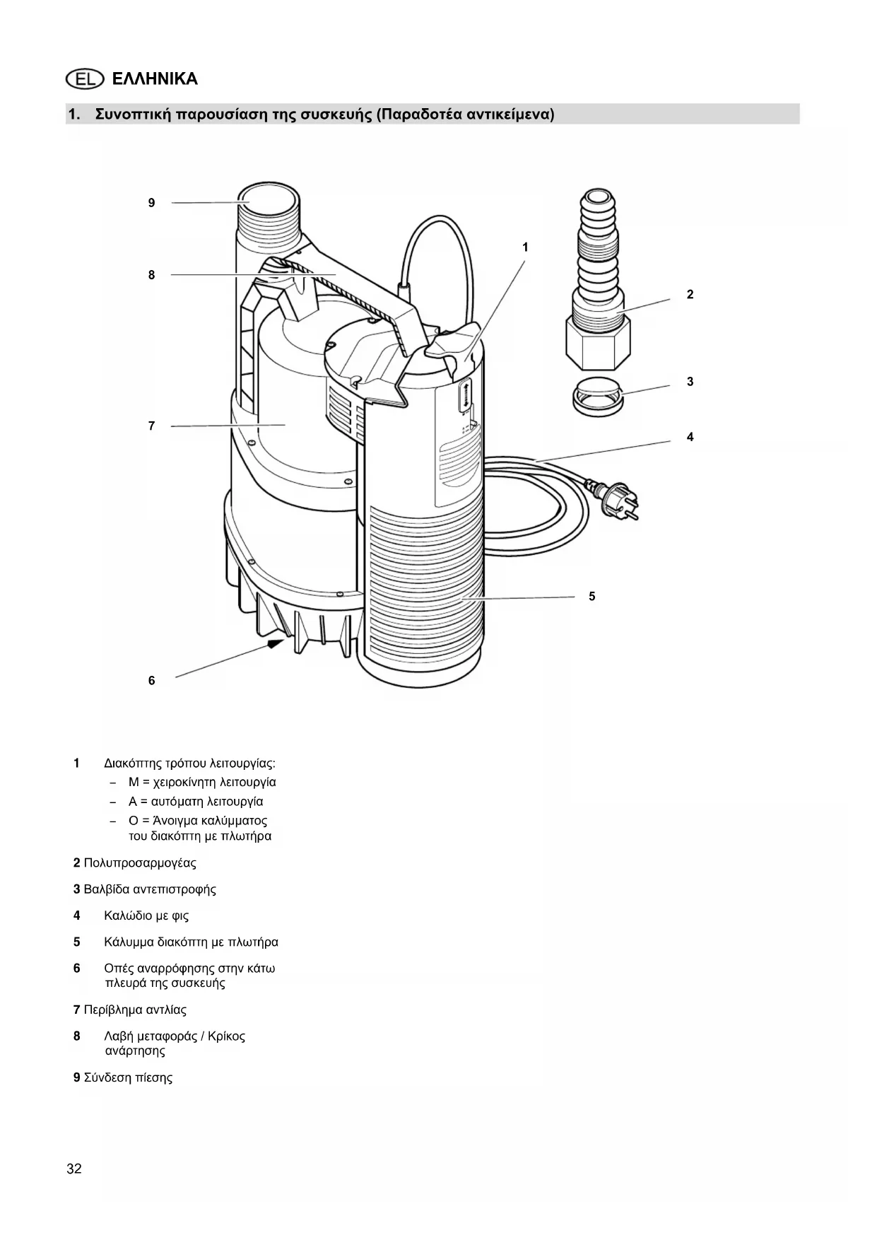 1 ∆ιακόπτης τρόπου λειτουργίας: M = χειροκίνητη λειτουργία A = αυτόματη λειτουργία O = Άνοιγμα καλύμματος του διακόπτη με πλωτήρα 2 Πολυπροσαρμογέας 3 Βαλβίδα αντεπιστροφής 4 Καλώδιο με φις 5 Κάλυμμα διακόπτη με πλωτήρα 6 Οπές αναρρόφησης στην κάτω πλευρά της συσκευής 7 Περίβλημα αντλίας 8 Λαβή μεταφοράς / Κρίκος