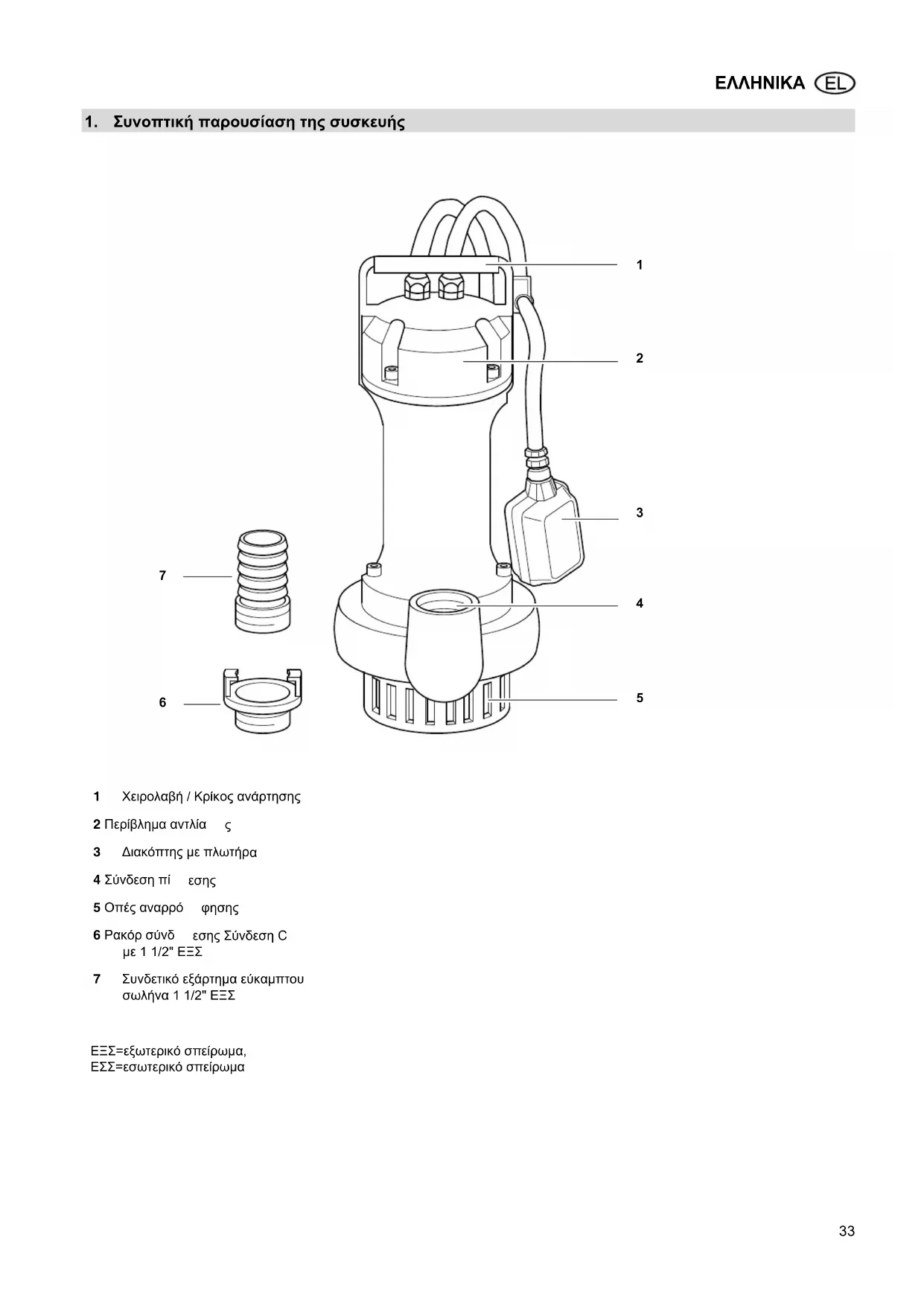 Πριν την έναρξη της λειτουργίας πρέπει να διαβάσετε διεξοδικά όλες αυτές τις οδηγίες λειτουργίας. Δώστε ιδιαίτερη προσοχή στις επισημάνσεις που αφορούν την ασφάλεια. Αυτές οι οδηγίες χρήσης απευθύνονται σε άτομα που έχουν βασικές τεχνικές γνώσεις αναφορικά με τη χρήση συσκευών όπως οι εδώ περιγραφόμενες. Αν δεν έχετε εμπειρία στη χρήση τέτοιων συσκευών, θα πρέπει να ζητήσετε άμεσα βοήθεια έμπειρων ατόμων. Φυλάξτε όλα τα έγγραφα πο συνοδεύουν τη συσκευή αυτή, ώστε να μπορείτε στο μέλλον να τα συμβουλευτείτε αν χρειαστεί. Επίσης φυλάξτε το παραστατικό αγοράς για την περίπτωση που χρειαστεί να γίνει χρήση της Εάν κάποτε δανείσετε ή πωλ τη συσκευή, δώστε μαζί και όλα τα συνοδευτικά έγγραφα της συσκευής ες που προκύπτουν επειδή δεν τηρήθηκαν οι παρούσες οδηγίες λειτουργίας, ο κατασκευαστής δεν αναλαμβάνει καμία ευθύνη. Οι πληροφορίες σε αυτές τις οδηγίες λειτουργίας ομαδοποιούνται υπό τις εξής σημάνσεις: Κίνδυνος! Προειδοποίηση για σωματικές βλάβες ή ζημίες στο περιβάλλον. Κίνδυνος ηλεκτροπληξίας! Προειδοποίηση για σωματικές βλάβες από ηλεκτρισμό. Προσοχή! Προειδοποίηση για υλικές ζημίες. Υπόδειξη: Συμπληρωματικές πληροφορίες. Οι αριθμ οί στις εικόνες (1, 2, 3, ...) υποδεικνύουν μεμονωμένα εξαρτήματα, πα ρατίθενται με διαδοχική αύξουσα αρίθμηση, ανα φέρονται στους αντίστοιχους αριθμούς στις παρενθέσεις (1), (2), (3) ... στο κείμενο δίπλα τους. ηγίες χειρισμού, στις οποίες πρέπει να τηρηθεί μία σειρά ροής ενεργειών, είναι αριθμημένες. ηγίες χειρισμού όπου δεν απαιτείται η τήρηση συγκεκριμένης σειράς ροής ενεργειών, έχουν από μπροστά τους μία τελεία. Οι λίστες έχ ουν από μπροστά μία παύλα. Η συσ κευή αυτή χρησιμεύει για τη μεταφορά νερού στο σπίτι και τον κήπο, όπως για παράδειγμα: για το άδειασμα μέσω άντλησης δεξαμενών, στραγγιστικών φρεάτων ή πλημμυρισμένων χώρων, ως αντλία φρέατος, για κυκλοφορία, για να διστεί ο σχηματισμός επικαθίσεων αλάτων και σκουριάς, για τη δημιουργία και λειτουργία τεχνητών υδάτινων ροών. Άλλα υλικά άντλησ Θαλασσινό νερό Αλμυρό νερό Ακάθαρτα ύδατα Υγρά καθαρισμού για υφάσματα Διαλύματα σαπουνιών Μη διαβρωτικά αλατούχα διαλύματα