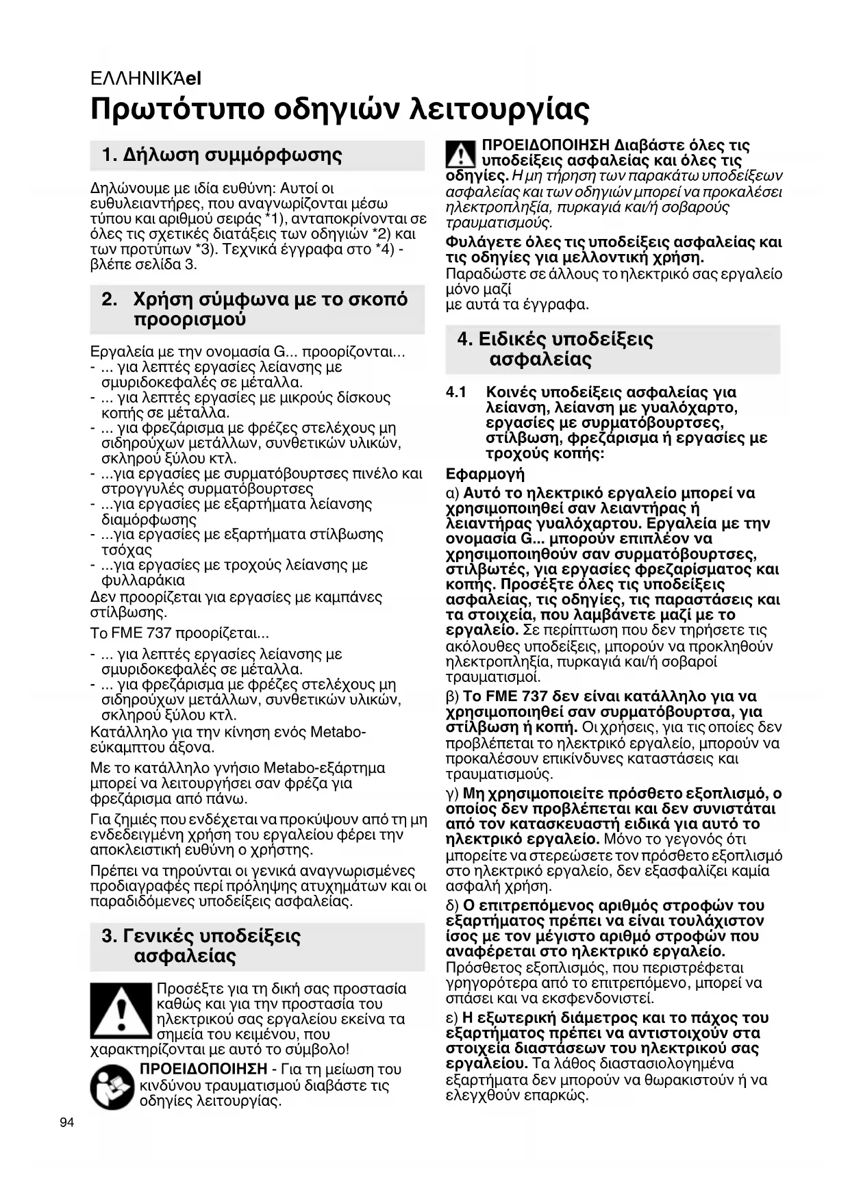 ονομασία G... μπορούν επιπλέον να χρησιμοποιηθούν σαν συρματόβουρτσες, στιλβωτές, για εργασίες φρεζαρίσματος και κοπής. Προσέξτε όλες τις υποδείξεις ασφαλείας, τις οδηγίες, τις παραστάσεις και τα στοιχεία, που λαμβάνετε μαζί με το εργαλείο. Σε περίπτωση που δεν τηρήσετε τις ακόλουθες υποδείξεις, μπορούν να προκληθούν ηλεκτροπληξία, πυρκαγιά και/ή σοβαροί τραυματισμοί. β) Το FME 737 δεν είναι κατάλληλο για να χρησιμοποιηθεί σαν συρματόβουρτσα, για στίλβωση ή κοπή. Οι χρήσεις, για τις οποίες δεν προβλέπεται το ηλεκτρικό εργαλείο, μπορούν να προκαλέσουν επικίνδυνες καταστάσεις και τραυματισμούς. γ) Μη χρησιμοποιείτε πρόσθετο εξοπλισμό, ο οποίος δεν προβλέπεται και δεν συνιστάται από τον κατασκευαστή ειδικά για αυτό το ηλεκτρικό εργαλείο. Μόνο το γεγονός ότι μπορείτε να στερεώσετε τον πρόσθετο εξοπλισμό στο ηλεκτρικό εργαλείο, δεν εξασφαλίζει καμία ασφαλή χρήση. δ) Ο επιτρεπόμενος αριθμός στροφών του εξαρτήματος πρέπει να είναι τουλάχιστον ίσος με τον μέγιστο αριθμό στροφών που αναφέρεται στο ηλεκτρικό εργαλείο. Πρόσθετος εξοπλισμός, που περιστρέφεται γρηγορότερα από το επιτρεπόμενο , μπορεί να σπάσει και να εκσφενδονιστεί. ε) Η εξωτερική διάμετρος και το πάχος του εξαρτήματος πρέπει να αντιστοιχούν στα στοιχεία διαστάσεων του ηλεκτρικού σας εργαλείου. Τα λάθος διαστασιολογημένα εξαρτήματα δεν μπορούν να θωρακιστούν ή να ελεγχθούν επαρκώς.