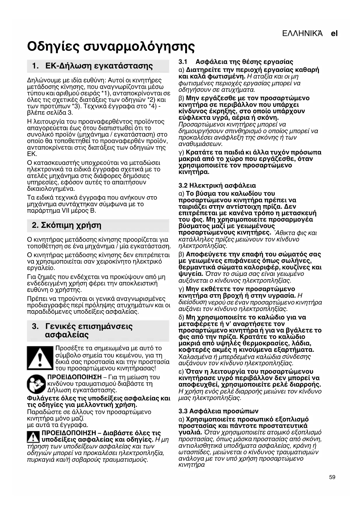 α) Δίνετε τον προσαρτώμενο κινητήρα σας για επισκευή σε άριστα ειδικευμένο προσωπικό, μόνο με γνήσια ανταλλακτικά. Έτσι εξασφαλίζεται η διατήρηση της ασφάλειας του προσαρτώμενου κινητήρα. Αυτός ο κινητήρας μετάδοσης κίνησης επιτρέπεται να λειτουργεί μόνο αν έχει τοποθετηθεί και στερεωθεί με ασφάλεια σε ένα μηχάνημα/ μία εγκατάσταση. Η απώλεια του ελέγχου μπορεί να οδηγήσει σε τραυματισμούς. Ο προσαρτώμενος κινητήρας δεν επιτρέπεται να χρησιμοποιείται σαν χειροκίνητο ηλεκτρικό εργαλείο. Οι χρήσεις, για τις οποίες δεν προβλέπεται ο προσαρτώμενος κινητήρας, μπορούν να προκαλέσουν επικίνδυνες καταστάσεις και τραυματισμούς. Ο προσαρτώμενος κινητήρας δεν διαθέτει προστασία επανεκκίνησης. Αποφεύγετε την ακούσια επανεκκίνηση: Απενεργοποιείτε πάντοτε το εργαλείο, όταν απομακρύνετε το φις από την πρίζα του ρεύματος ή όταν παρουσιαστεί μια διακοπή ρεύματος. Ο επιτρεπτός αριθμός στροφών του μηχανήματος / της εγκατάστασης πρέπει να είναι ίσος ή μεγαλύτερος από το μέγιστο αριθμό στροφών που αναφέρεται στον προσαρτώμενο κινητήρα. Δομικά στοιχεία, που περιστρέφονται γρηγορότερα