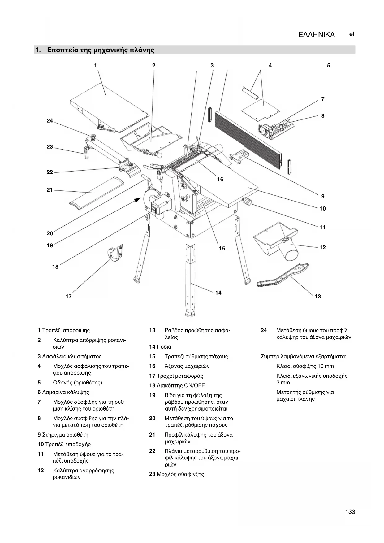 23 Μοχλός σύσφιγξης 24 Μετάθεση ύψους του προφίλ κάλυψης του άξονα μαχαιριών Συμπεριλαμβανόμενα εξαρτήματα: Κλειδί σύσφιξης 10 mm Κλειδί εξαγωνικής υποδοχής 3mm Μετρητής ρύθμισης για μαχαίρι πλάνης HC260_XW0014D5_el.fm Πρωτότυπο οδηγιών λειτουρ- γίας134