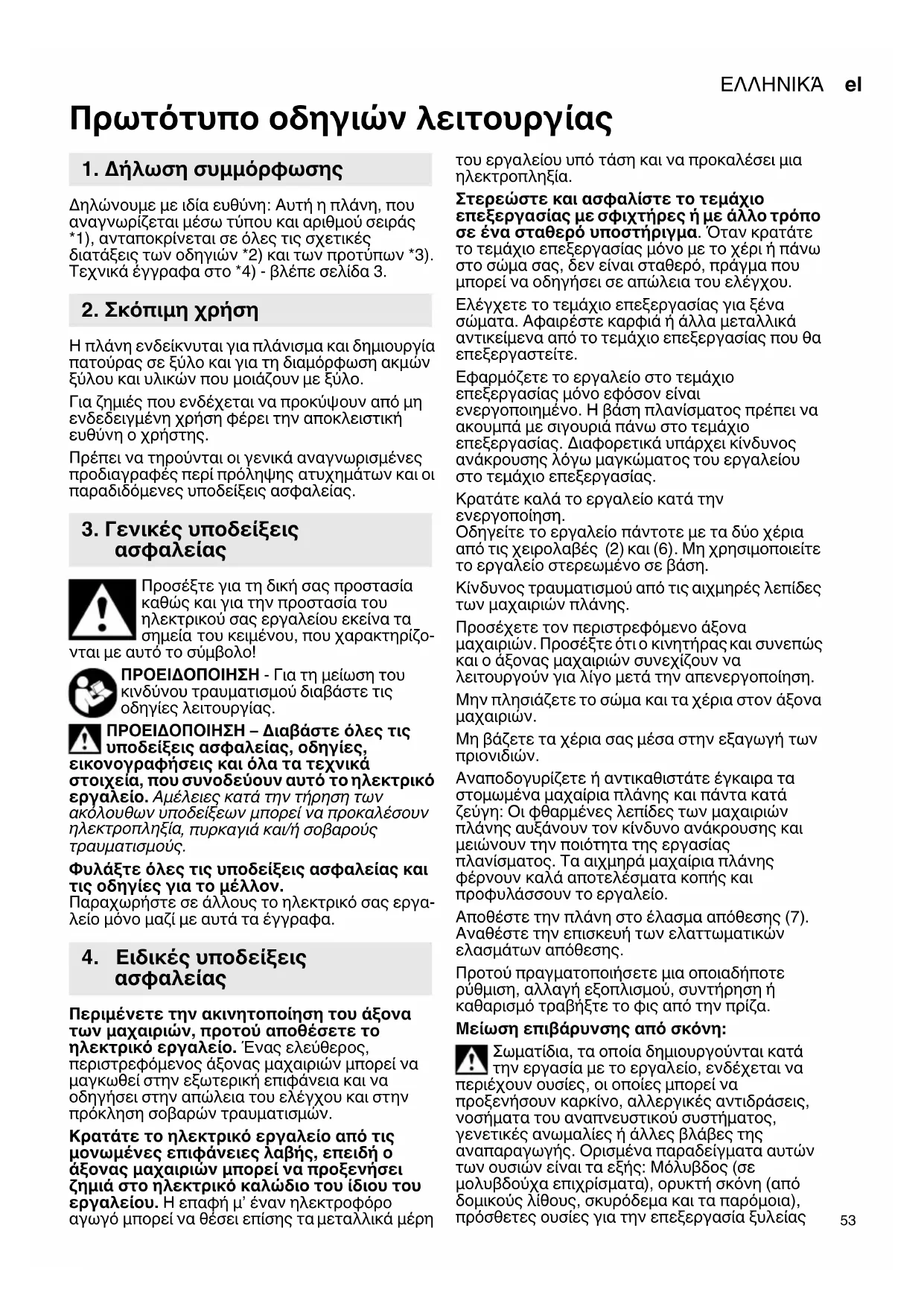 Πρωτότυπο οδηγιών λειτουργίας Δηλώνουμε με ιδία ευθύνη: Αυτή η πλάνη, που αναγνωρίζεται μέσω τύπου και αριθμού σειράς *1), ανταποκρίνεται σε όλες τις σχετικές διατάξεις των οδηγιών *2) και των προτύπων *3). Τεχνικά έγγραφα στο *4) - βλέπε σελίδα 3. Η πλάνη ενδείκνυται για πλάνισμα και δημιουργία πατούρας σε ξύλο και για τη διαμόρφωση ακμών ξύλου και υλικών που μοιάζουν