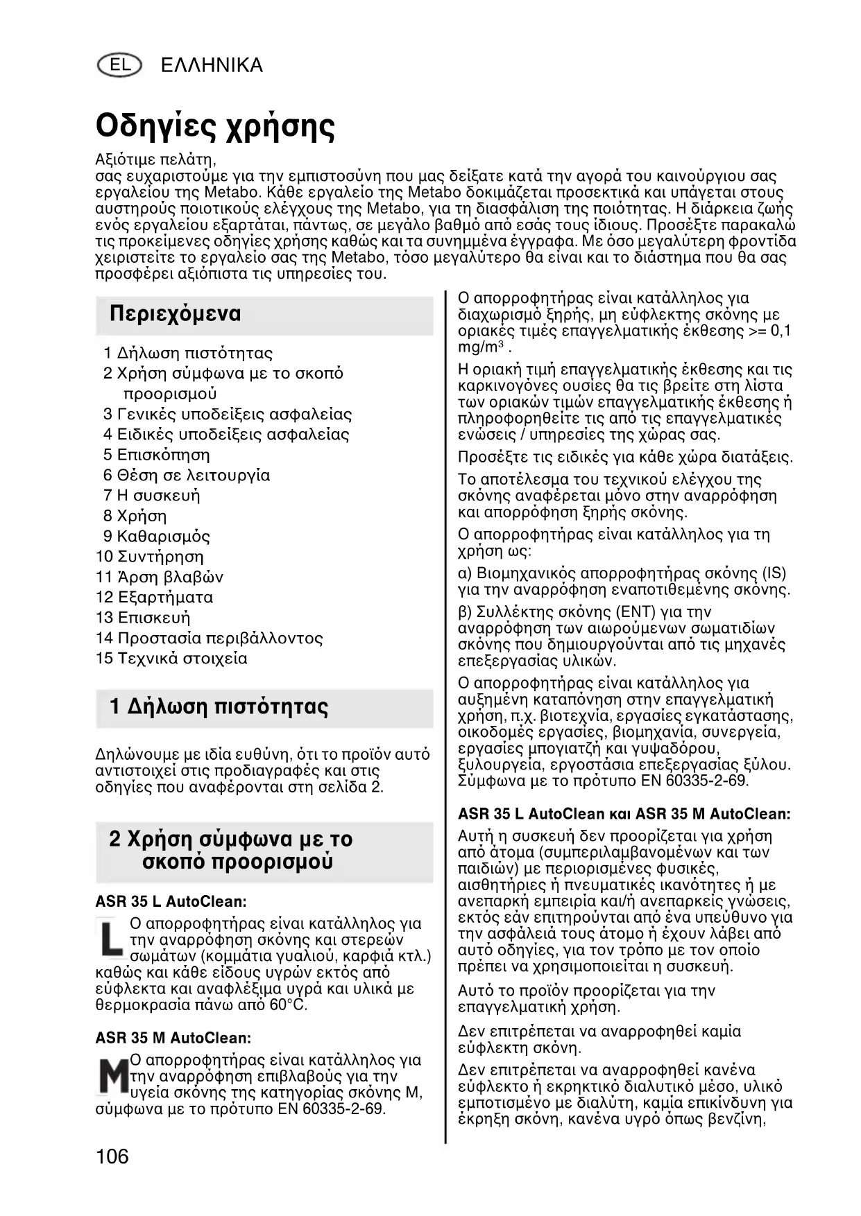 1 Δήλωση πισττητας 2 Χρήση σύμφωνα με το σκοπ προορισμού 17027067_0711 ASR 35 L_M AutoClean ENTWURF.book Seite 106 Montag, 25. Juli 2011 4:46 16ΕΛΛΗΝΙΚA