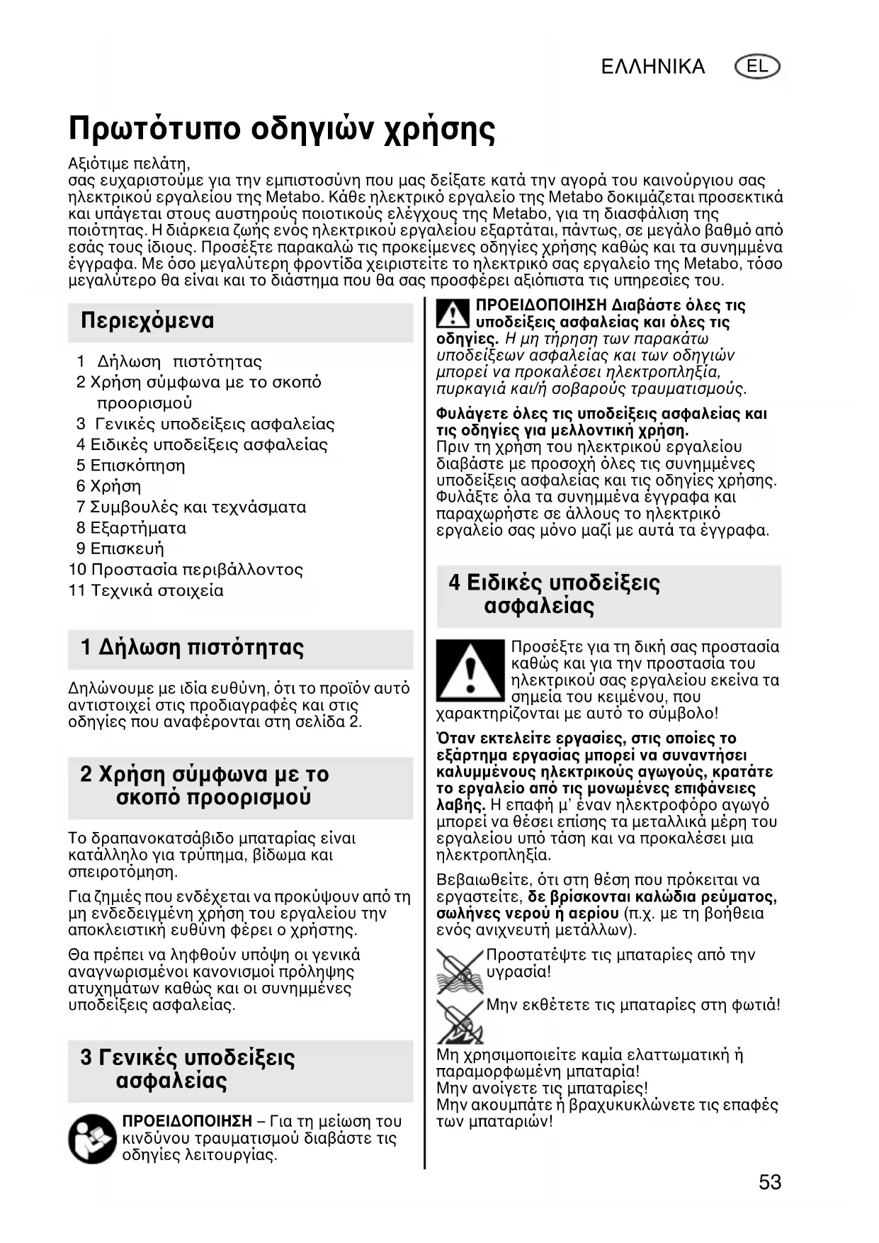 Μην εκθέτετε τις μπαταρίες στη φωτιά! Μη χρησιμοποιείτε καμία ελαττωματική ή παραμορφωμένη μπαταρία! Μην ανοίγετε τις μπαταρίες! Μην ακουμπάτε ή βραχυκυκλώνετε τις επαφές των μπαταριών! Πρωττυπο οδηγιών χρήσης Αξιτιμε πελάτη, σας ευχαριστούμε για την εμπιστοσύνη που μας δείξατε κατά την αγορά του καινούργιου σας ηλεκτρικού εργαλείου της Metabo. Κάθε ηλεκτρικ εργαλείο της Metabo δοκιμάζεται προσεκτικά και υπάγεται στους αυστηρούς ποιοτικούς ελέγχους της Metabo, για τη διασφάλιση της ποιτητας. Η διάρκεια ζωής ενς ηλεκτρικού εργαλείου εξαρτάται, πάντως, σε μεγάλο βαθμ απ εσάς τους ίδιους. Προσέξτε παρακαλώ τις προκείμενες οδηγίες χρήσης καθώς και τα συνημμένα έγγραφα. Με σο μεγαλύτερη φροντίδα χειριστείτε το ηλεκτρικ σας εργαλείο της Metabo, τσο μεγαλύτερο θα είναι και το διάστημα που θα σας προσφέρει αξιπιστα τις υπηρεσίες του.