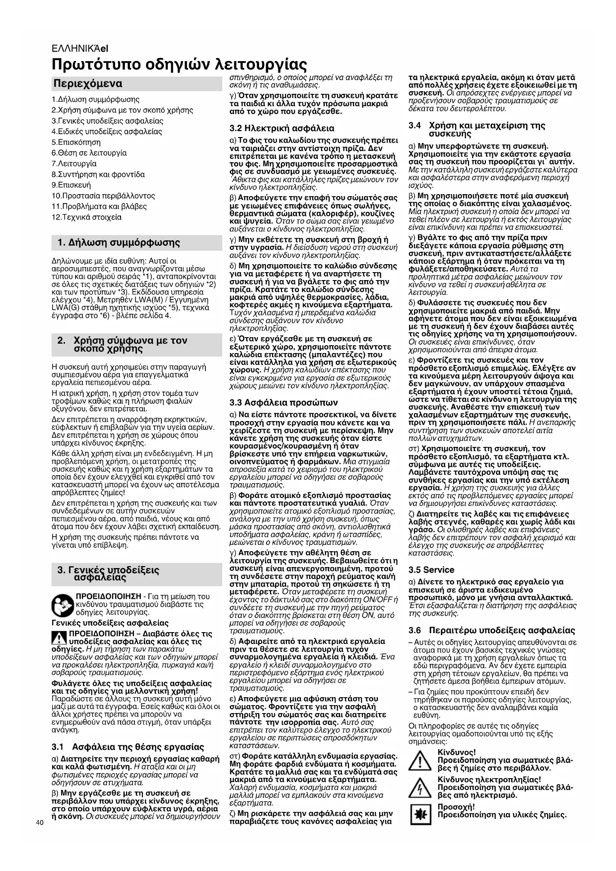 (αναλόγως του μοντέλου) Διαβάστε τις οδηγίες λειτουργίας. Φοράτε προστατευτικά γυαλιά Φοράτε ωτοασπίδες. Προειδοποίηση από ενδεχόμενη αυτόματη εκκίνηση. Προειδοποίηση από επικίνδυνη ηλεκτρική τάση. Εγγυημένη στάθμη ηχητικής απόδοσης.