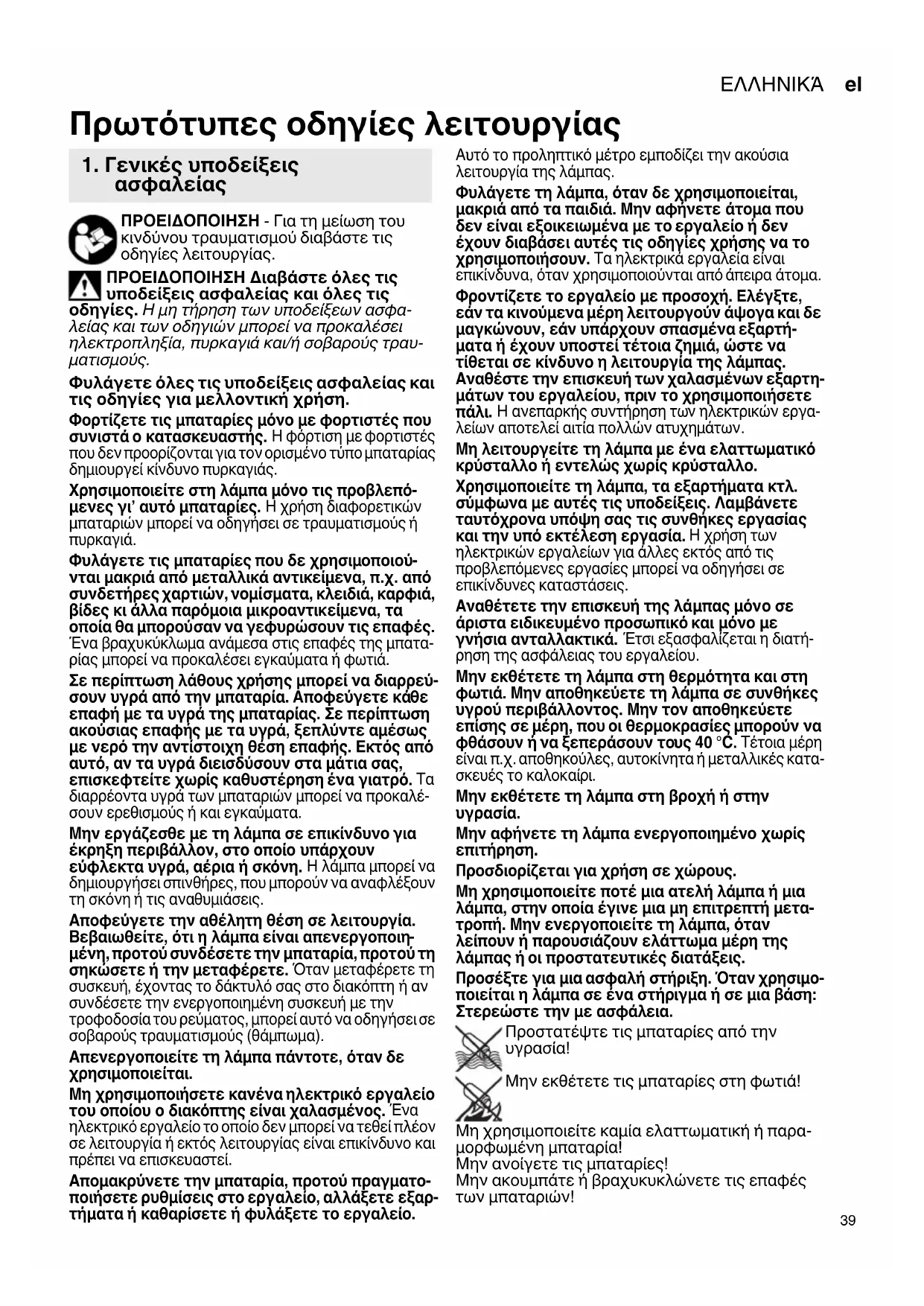 Φυλάγετε όλες τις υποδείξεις ασφαλείας και τις οδηγίες για μελλοντική χρήση. Φορτίζετε τις μπαταρίες μόνο με φορτιστές που συνιστά ο κατασκευαστής. Η φόρτιση με φορτιστές που δεν προορίζονται για τον ορισμένο τύπο μπαταρίας δημιουργεί κίνδυνο πυρκαγιάς. Χρησιμοποιείτε στη λάμπα μόνο τις προβλεπό- μενες γι’ αυτό μπαταρίες. Η χρήση διαφορετικών μπαταριών μπορεί να οδηγήσει σε τραυματισμούς ή