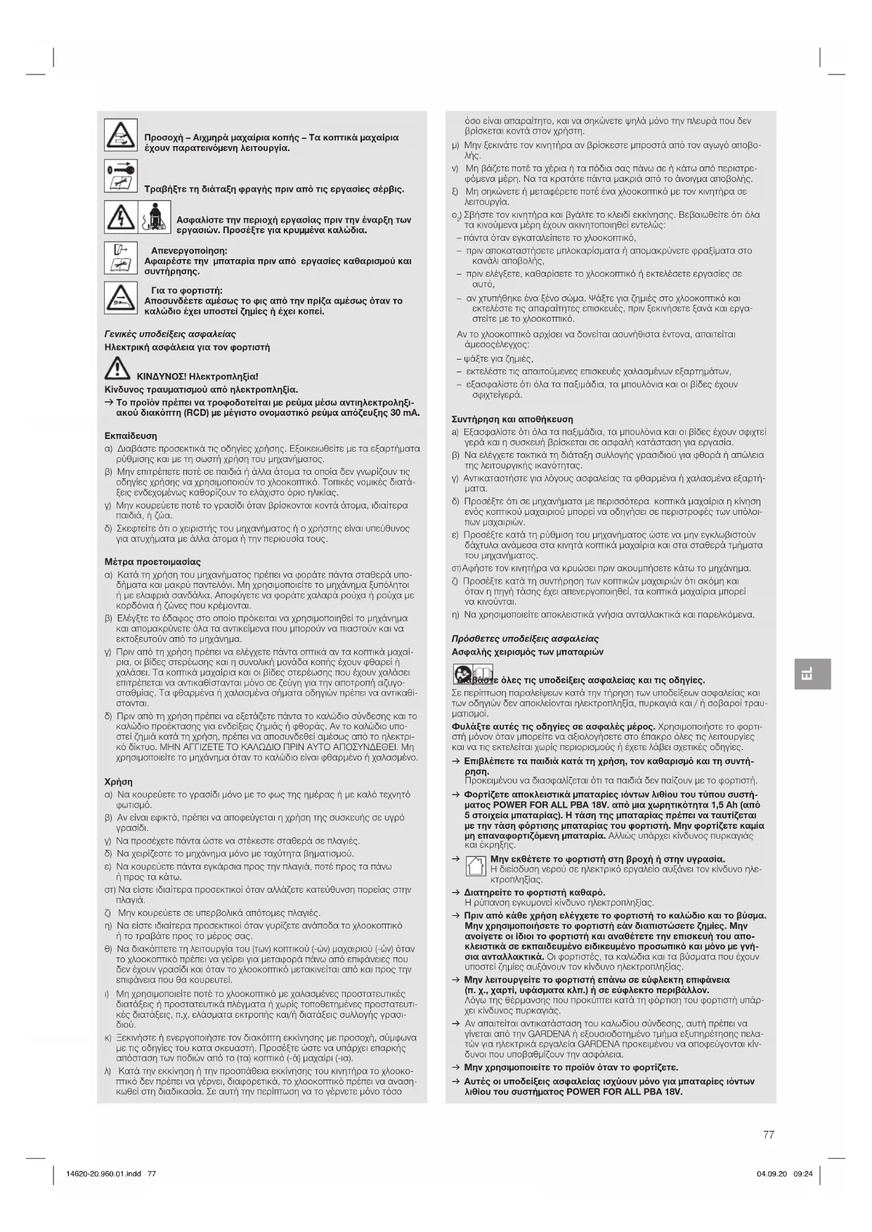 Μην εκθέτετε το φορτιστή στη βροχή ή στην υγρασία. Η διείσδυση νερού σε ηλεκτρικό εργαλείο αυξάνει τον κίνδυνο ηλε- κτροπληξίας. v Διατηρείτε το φορτιστή καθαρό. Η ρύπανση εγκυμονεί κίνδυνο ηλεκτροπληξίας. v Πριν από κάθε χρήση ελέγχετε το φορτιστή το καλώδιο και το βύσμα. Μην χρησιμοποιήσετε το φορτιστή εάν διαπιστώσετε ζημίες. Μην ανοίγετε οι ίδιοι το φορτιστή και αναθέτετε την επισκευή του απο- κλειστικά σε εκπαιδευμένο ειδικευμένο προσωπικό και μόνο με γνή- σια ανταλλακτικά. Οι φορτιστές, τα καλώδια και τα βύσματα που έχουν υποστεί ζημίες αυξάνουν τον κίνδυνο ηλεκτροπληξίας. v Μην λειτουργείτε το φορτιστή επάνω σε εύφλεκτη επιφάνεια (π. χ., χαρτί, υφάσματα κλπ.) ή σε εύφλεκτο περιβάλλον. Λόγω της θέρμανσης που προκύπτει κατά τη φόρτιση του φορτιστή υπάρ- χει κίνδυνος πυρκαγιάς. v Αν απαιτείται αντικατάσταση του καλωδίου σύνδεσης, αυτή πρέπει να γίνεται από την GARDENA ή εξουσιοδοτημένο τμήμα εξυπηρέτησης πελα- τών για ηλεκτρικά εργαλεία GARDENA προκειμένου να αποφεύγονται κίν- δυνοι που υποβαθμίζουν την ασφάλεια. v Μην χρησιμοποιείτε το προϊόν όταν το φορτίζετε. v Αυτές οι υποδείξεις ασφαλείας ισχύουν μόνο για μπαταρίες ιόντων λιθίου του συστήματος POWER FOR ALL PBA 18V. 14620-20.960.01.indd 77 04.09.20 09:24EL